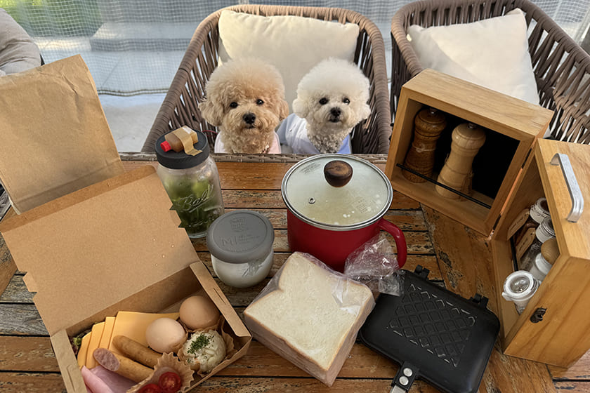 わんちゃんメニューもあるようでしたが、空とクルムは持参したご飯で一緒にディナータイムを楽しみました。食後はお庭で焚き火をしたのですが、そのときに作ってあげた焼き芋に大興奮! いつもと違うシチュエーションで食べる出来立てアツアツの焼き芋は相当美味しかったようです(笑)