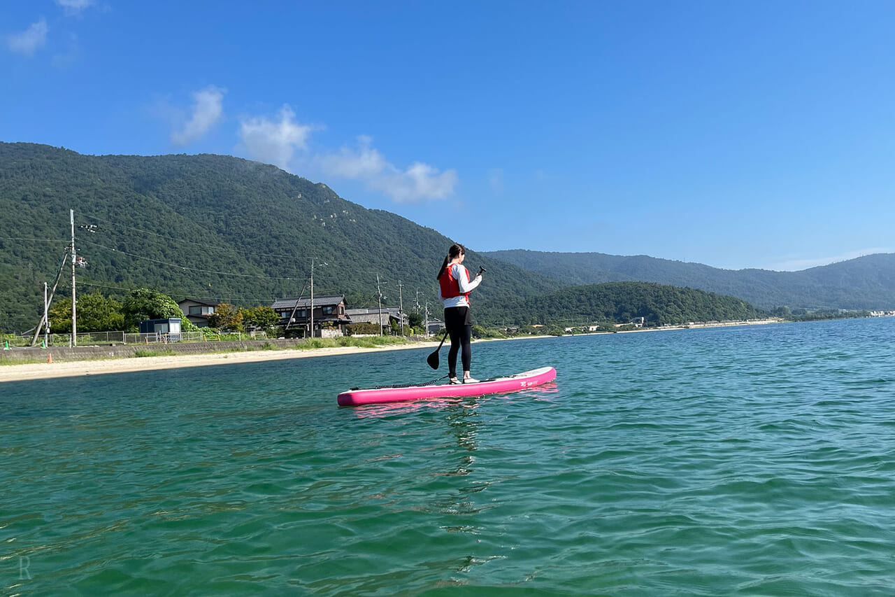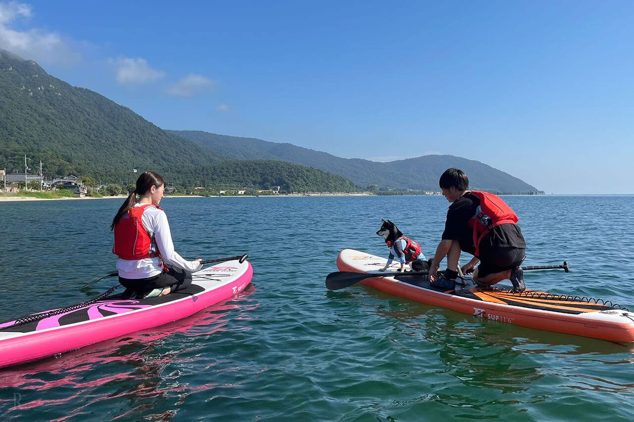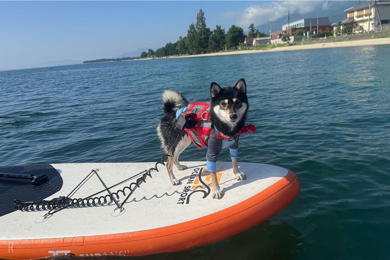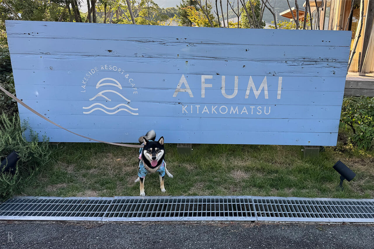 ひと息ついたら、一番楽しみにしていたアクティビティを体験しに琵琶湖へ!『AFUMI KITAKOMATSU』では、愛犬と一緒にSUP体験(事前予約制)をすることができるのです。この日は天気に恵まれ、風もなく波も穏やかで絶好のSUP日和。湖上から眺める景色は最高のひとことで、非日常な時間を満喫しました。はるも怖がることなく、凛々しい姿を披露してくれて感激!スタッフさんの指導もとても丁寧で親切ですし、犬用のタオルも貸してもらえる手厚さが嬉しかったです。