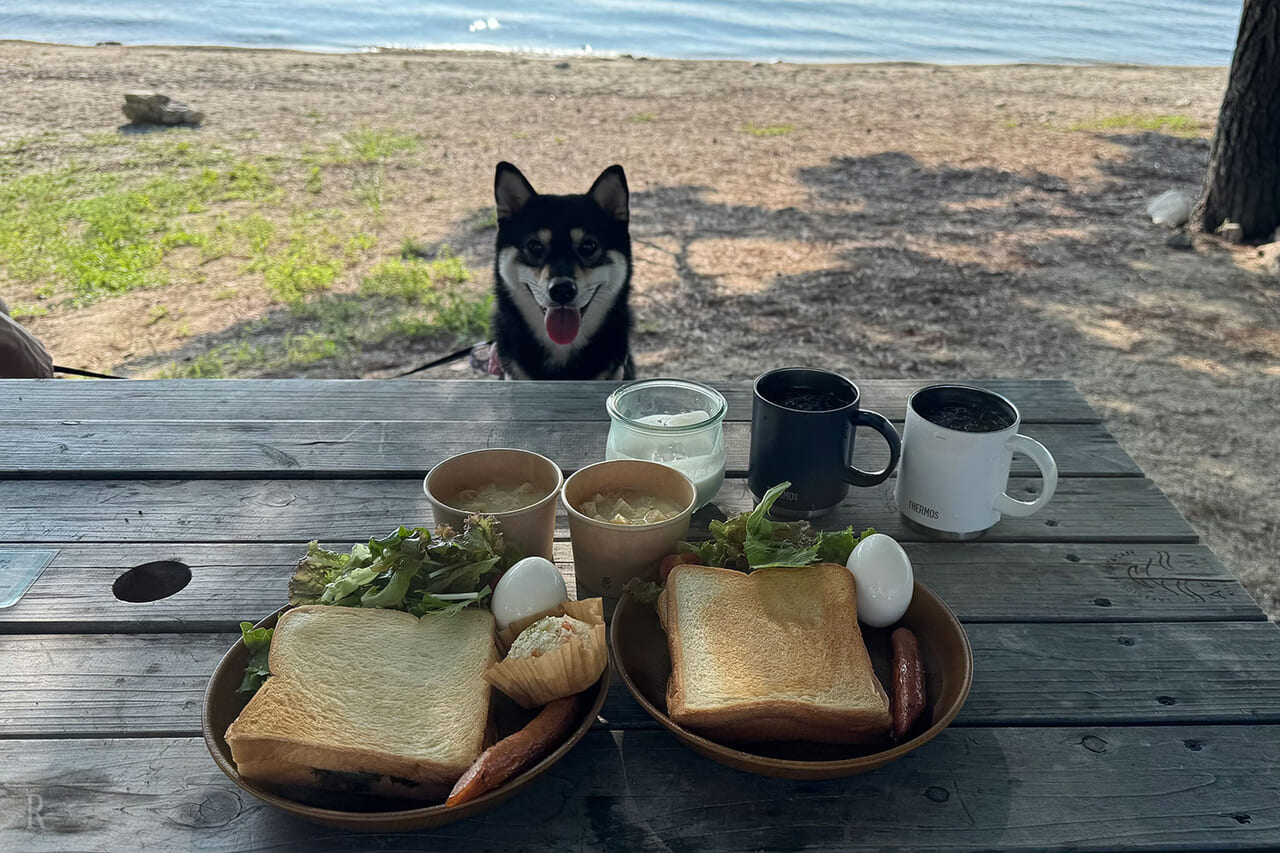 朝食はピクニックセットが用意されています。もちろんお部屋で食べてもOKですが、おすすめは琵琶湖までのピクニック!キラキラと光る湖面を眺めながらの朝食は贅沢の極みで、サンドイッチのおいしさも格別です。はるにもモーニングプレートを作ってもらい、朝から優雅な時間を満喫です。