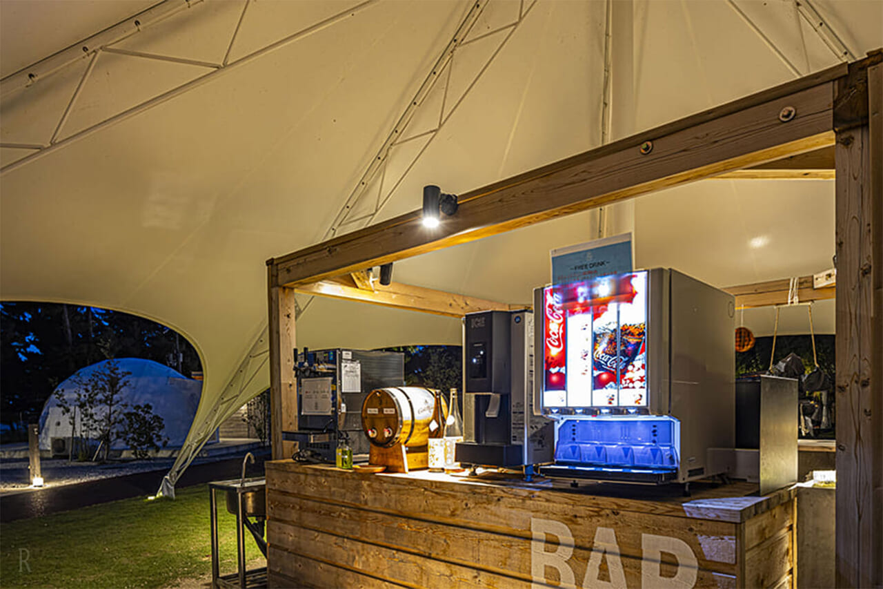 管理棟脇には共有スペースのドームテントがあり、中はBarになっているという面白い仕様。昼間はソフトドリンクやポップコーン、夜はアルコールが好きなだけ楽しめます、夏は限定でかき氷のサービスもあるのだとか!飲み物やおやつを持参しなくてもいいので助かりました。