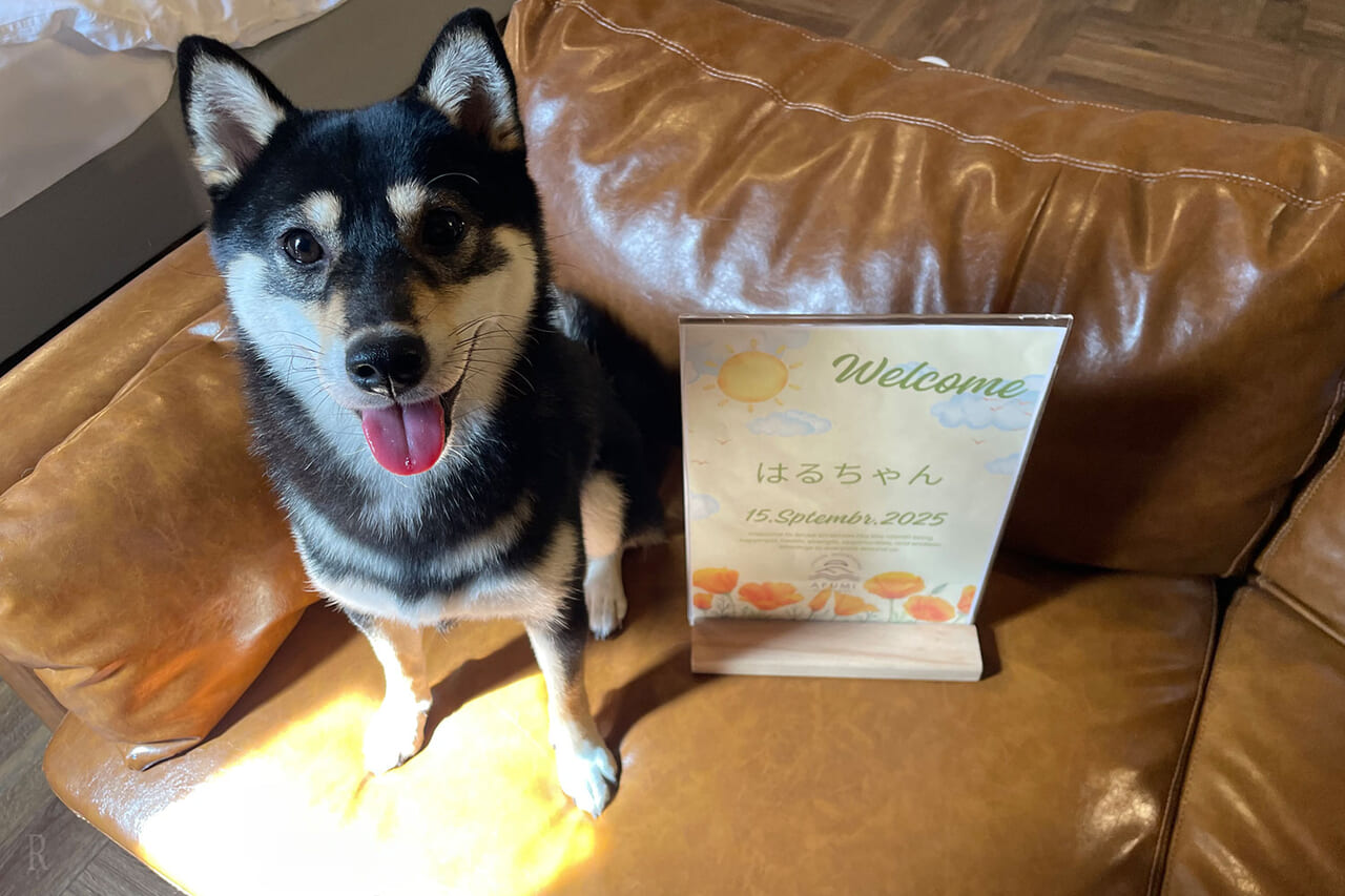 冷暖房はもちろん、空気清浄機やドッグアメニティ、さらにわんちゃんのためのウェルカムボードとおやつが用意されているドッグフレンドリーさ!おやつは添加物・香料・保存料を使わない天然鹿ジャーキーで、愛犬への細やかな気遣いを感じて嬉しくなりました。