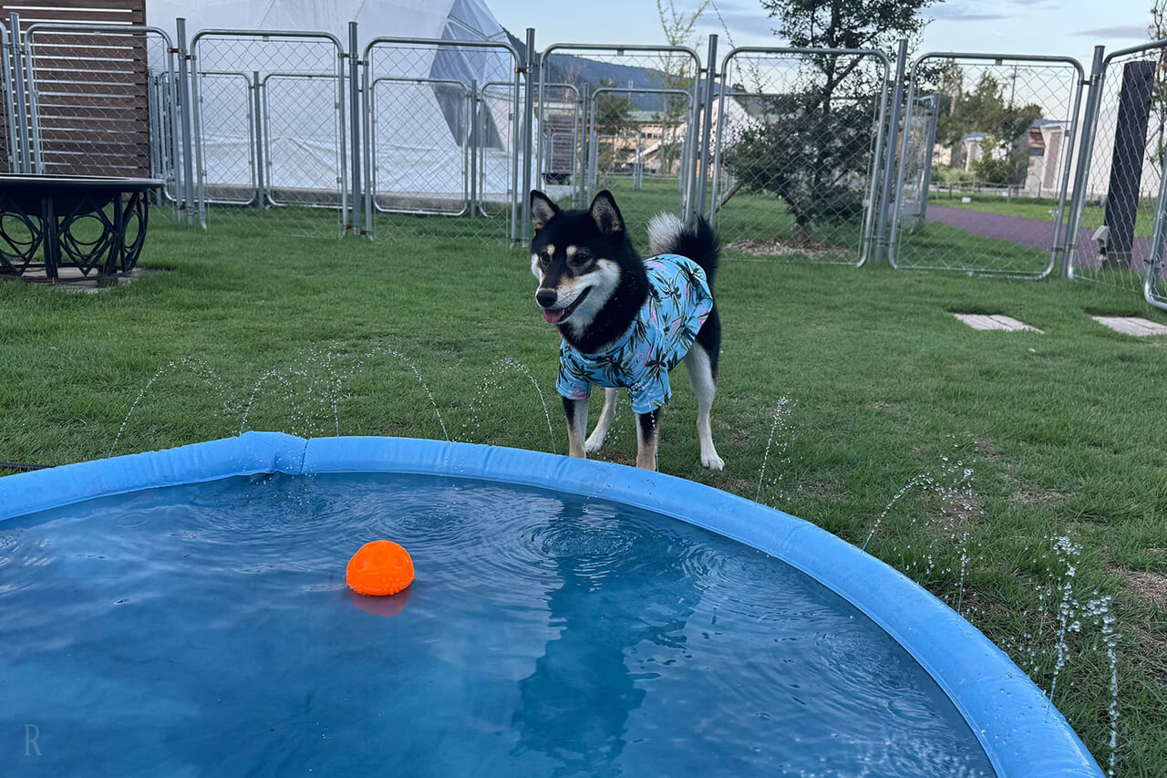 お部屋に戻ってからも、はるはドッグプール(夏季限定)で大はしゃぎ!プライベートドッグランの中に用意してもらえるので、ほかのわんちゃんとの接触事故の心配もなく、安心して遊ばせてあげられました。飼い主だけじゃなく、愛犬も楽しめるコンテンツが充実しているのは大きな魅力だと思います。