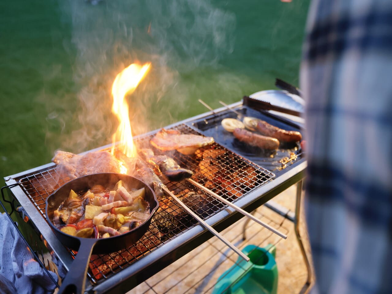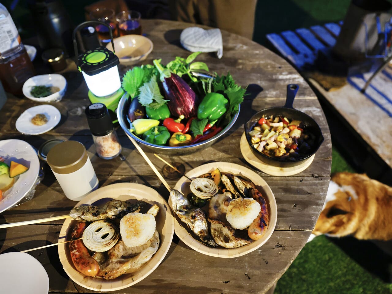 夕食はドッグラン内のBBQスペースで楽しみます。他の宿泊客の利用時間と重ならないよう調整してもらえるので、誰にも邪魔されることがないのも魅力。しかも屋根付きのため、天候に左右されず焼いている間わんこたちはドッグランで遊ばせてあげられるのもポイントです。