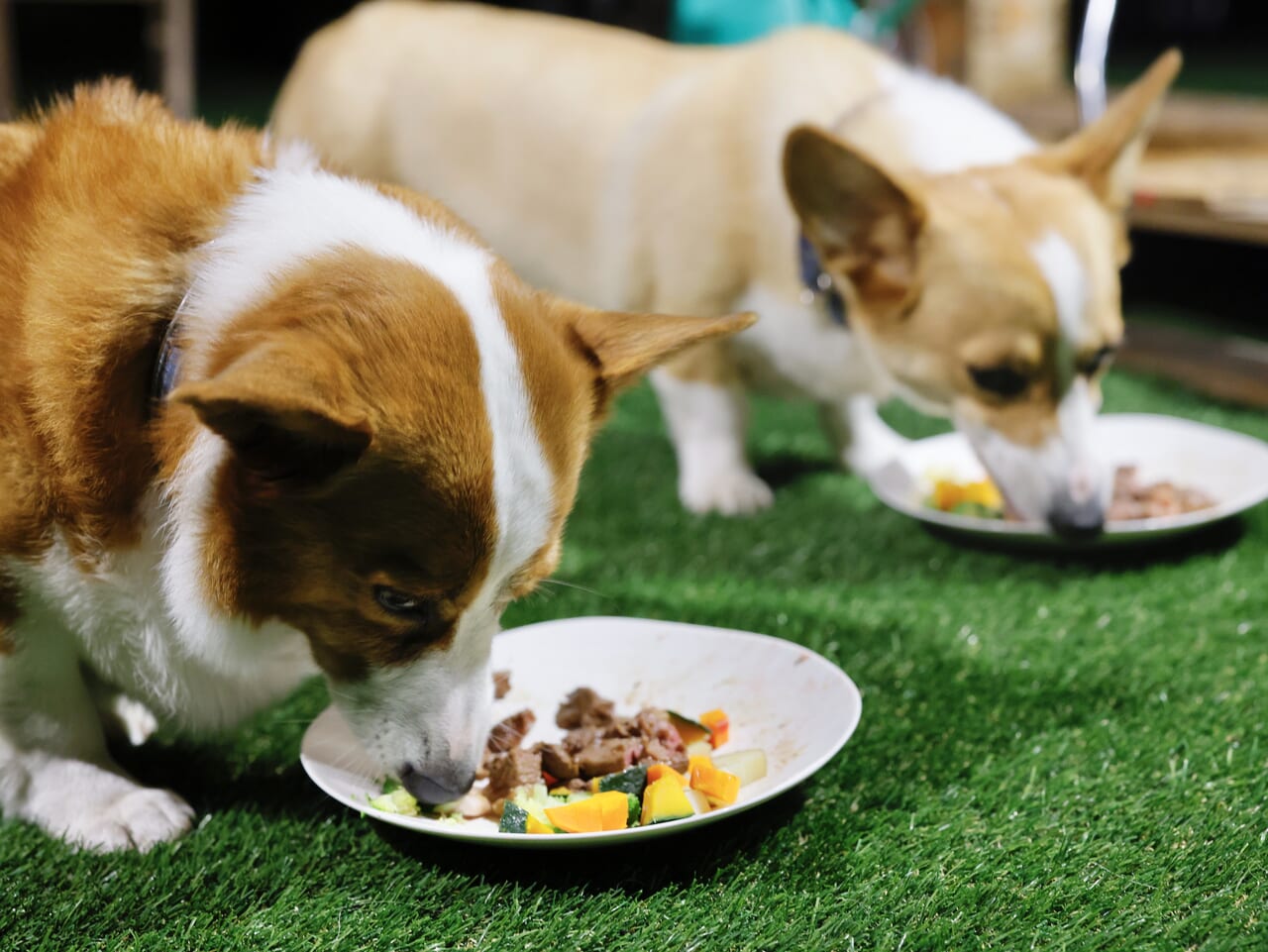 ここではわんこメニューも用意されていて、なんと贅沢なラムの骨付き肉!焼いてすぐ香ばしい匂いが漂うと、ぴーぷーは“私たちのごはん!”と大騒ぎ。目をきらきらさせて食べる姿にこちらまで幸せな気持ちになりました。