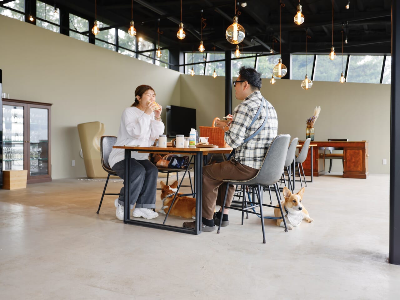 朝食は8時以降、希望時間にお部屋に運んでもらえます。晴れていれば夕飯と同様ドッグランで食べられたのですが、この日は雨模様だったので2階のバーでいただきました。わんこも入れてもらえた臨機応変さにも感動しながら、特別飼料で育った卵のおいしさにびっくり!