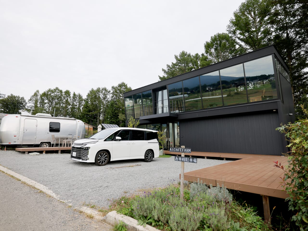 中央道・長坂ICを降りて山道を10分ほど進むと、田んぼの目の前にスタイリッシュな黒い建物が現れます。ここが「アイカフェファーム」。全国の建築家が選ぶコンテスト「Store Front Concours」でグランプリを受賞したという外観は、自然の中にすっと溶け込みつつも圧倒的な存在感を放ちます。