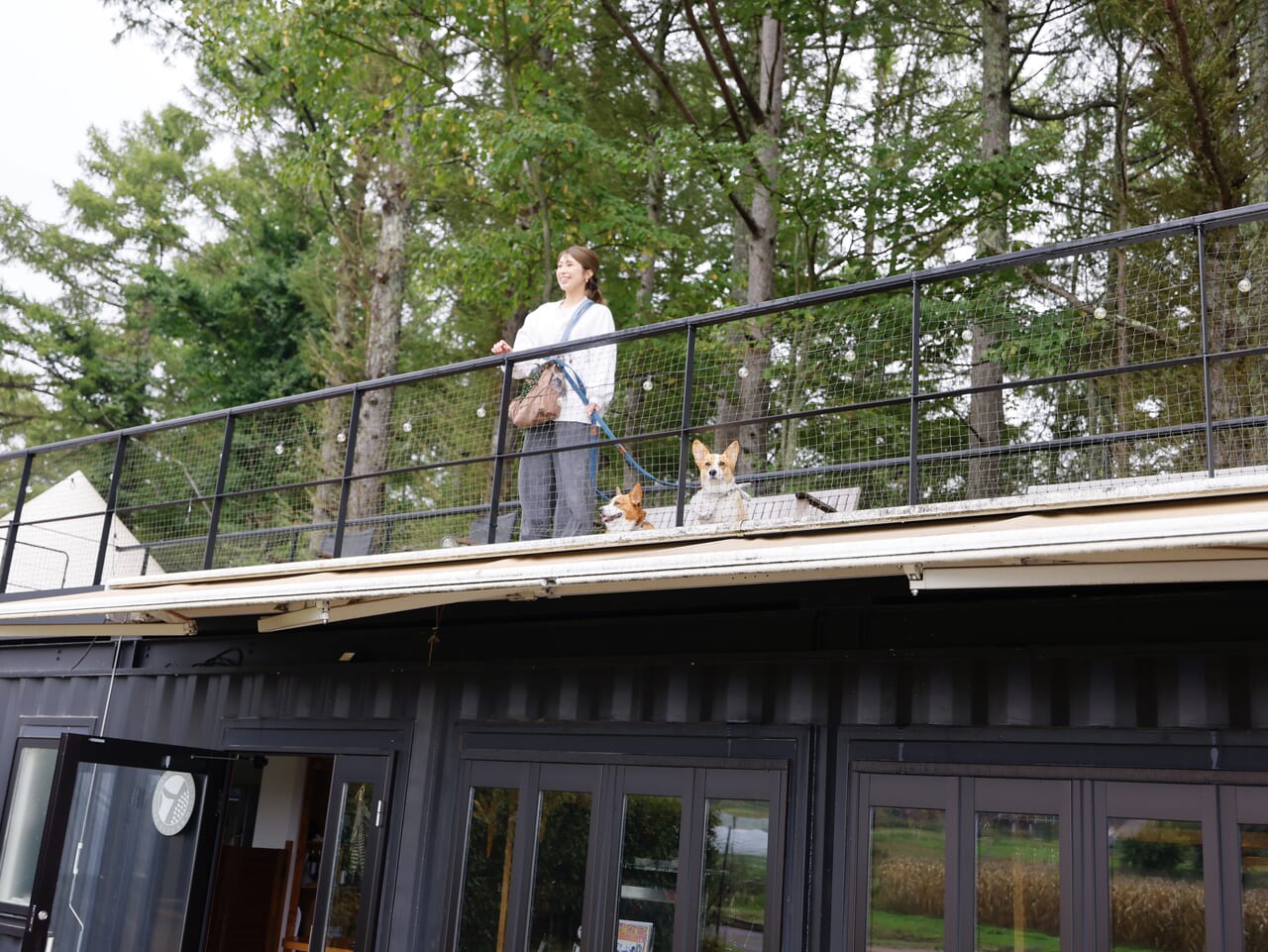 フロント前には焚き火スペースがあり、希望すれば焚き火が楽しめるとのこと。さらにフロントは屋上がルーフトップバルコニーになっていて、柵を閉めればわんちゃんもフリーで遊ばせてOKなんだとか。