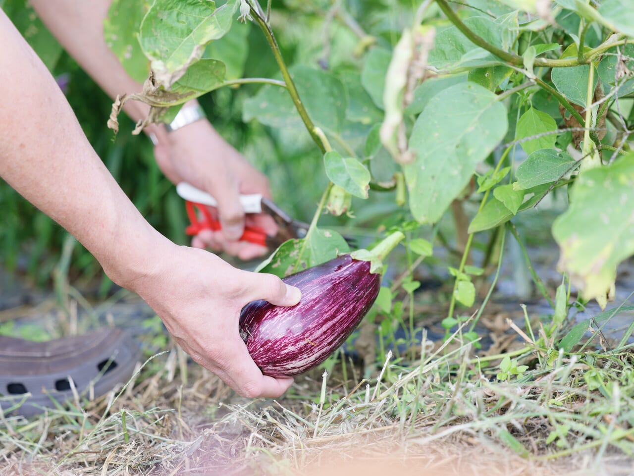 この日は3種類のナスとピーマン、シソ、バジル、トマト、ししとうを収穫しました。野菜はすべて無添加・無農薬!しかも、その場で採ったばかりの野菜を試食することもできるのです。