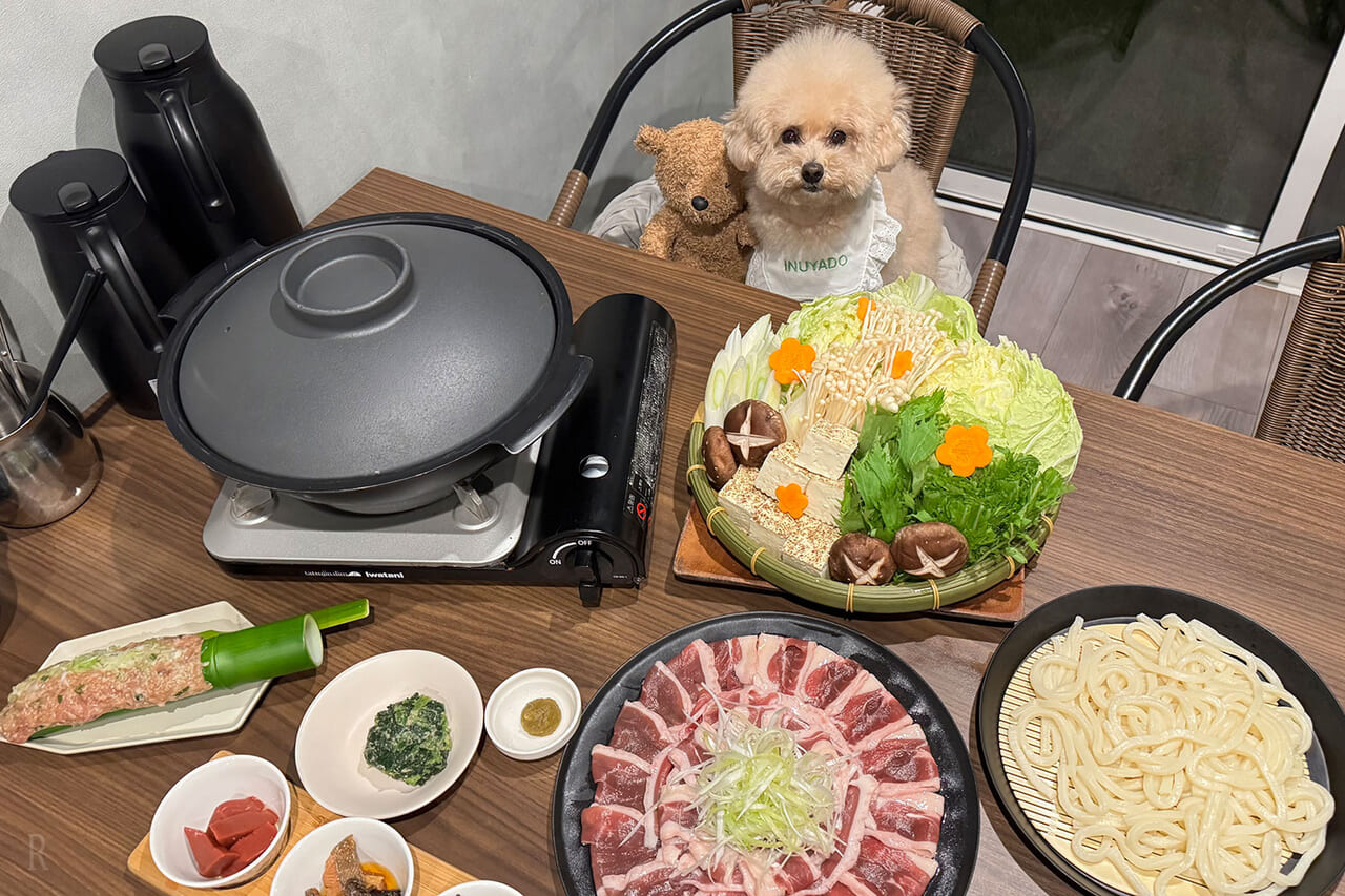 夕食は楽しみにしていた「近江鴨鍋」です。食材はスタッフさんがキャビンまで届けてくれるので、私たちはお鍋をセットするだけ。メニューは前菜3種、ほうれん草の胡麻和え、鴨肉・つみれ・お野菜盛り、うどん、プチデザートと盛りだくさん。あっさりした特製出汁で、母とふたりでぺろりと完食してしまいました。