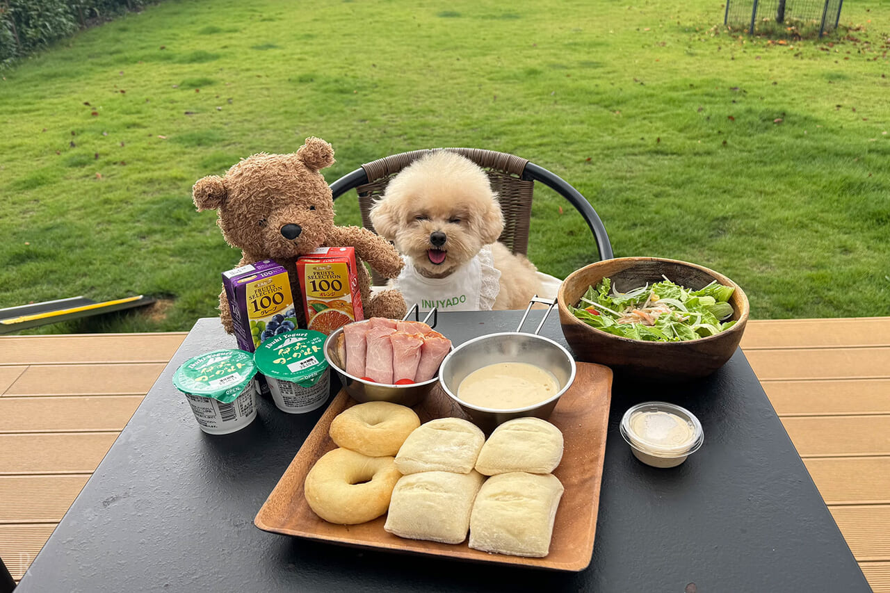 朝食は前夜に届いていた「自分で作るサンドイッチ」。チーズソースが絶品で、ハムやごぼうサラダを挟んで楽しみました。フレッシュジュースとヨーグルト付きで、ボリュームもちょうどいい感じ。自分たちのペースで食べられるので、朝も比較的ゆっくり過ごせたのがよかったです。
