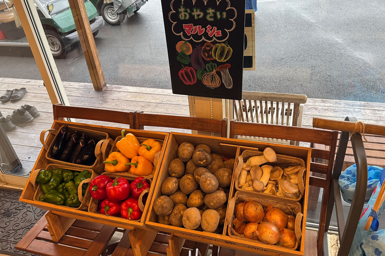 管理棟でチェックインを済ませると、まずは「おやさいマルシェ」体験!用意されたお野菜の中から、1回に限り好きなだけ取り放題というサービスです。こうしたちょっとした体験が、旅の始まりを楽しくしてくれました。