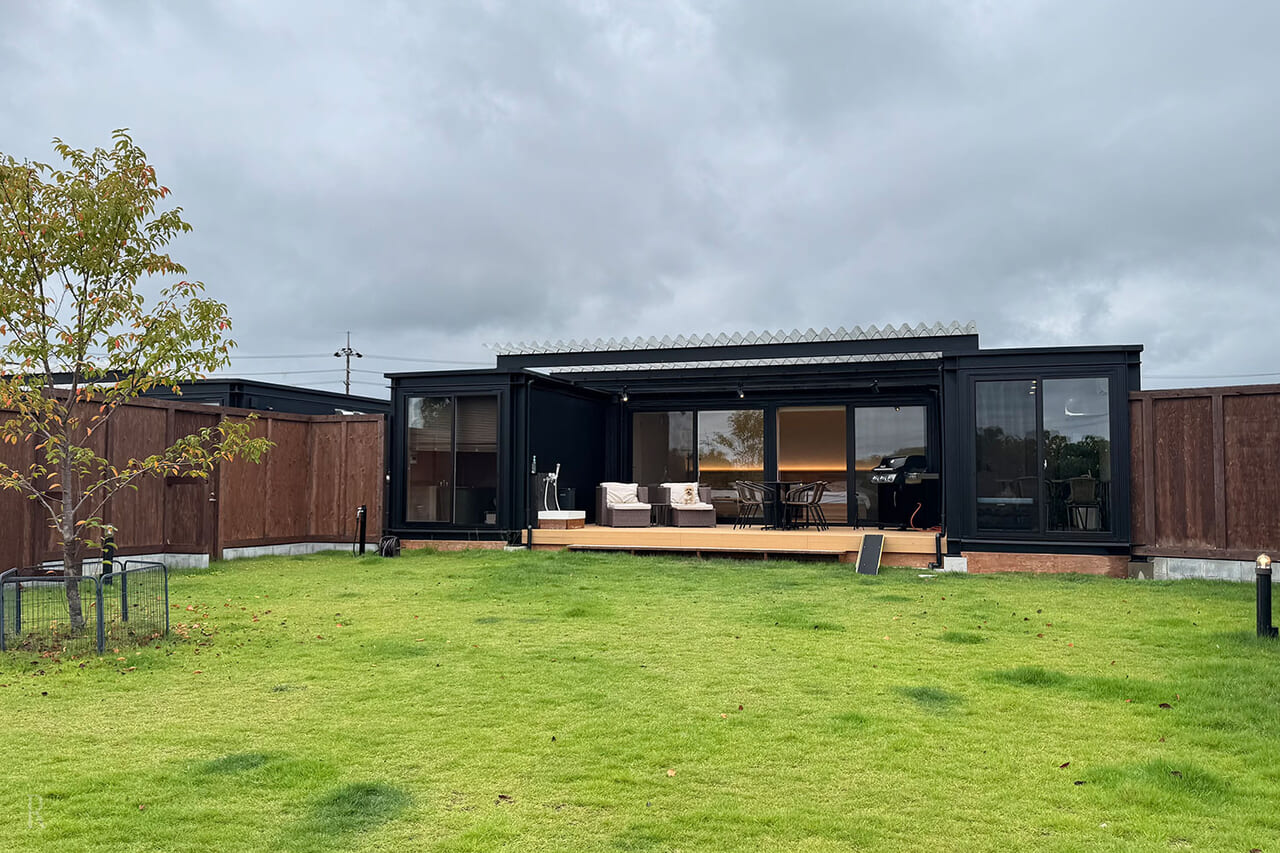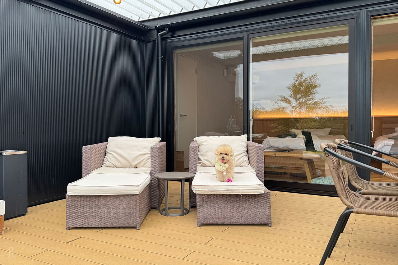 お部屋にはプライベートドッグランがついていて、複数頭でも走り回れそうな広さに驚きました。プライベートランを見渡すように屋根付きのBBQスペースも確保されていて、天候に左右されずBBQが楽しめるのも魅力です。