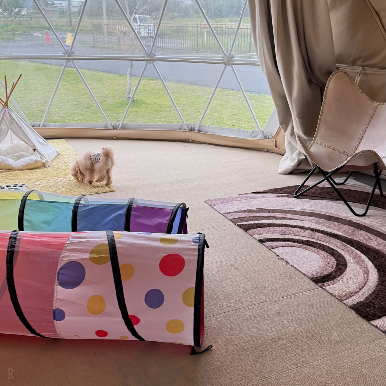 『ドギーズ今津浜』の魅力は、ドームを使った室内ランが用意されていること。チェックイン時に空き状況に合わせて予約でき、30分間貸切で遊ばせてあげることができます。ドーム内にはタイルカーペット敷き詰められていて、足が滑る心配もなし。アジリティも用意されていて、れおはトンネルやおもちゃに夢中でした。ほかのわんちゃんを気にせず遊べるだけでなく、どんな天気でもOKの貸切空間は、雨の日の救世主となりました。
