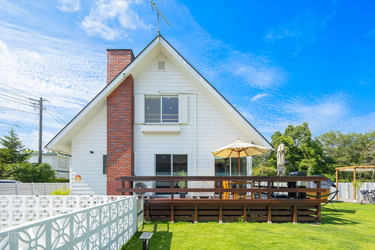 九十九里浜から車で5分。サーファーたちに愛される海辺の街に、真っ白な外観が印象的なヴィラが現れました。敷地内には駐車場があり、荷物の出し入れもスムーズ。チェックインもセルフなので、誰に会うこともなく“別荘”ライクなステイが楽しめます。