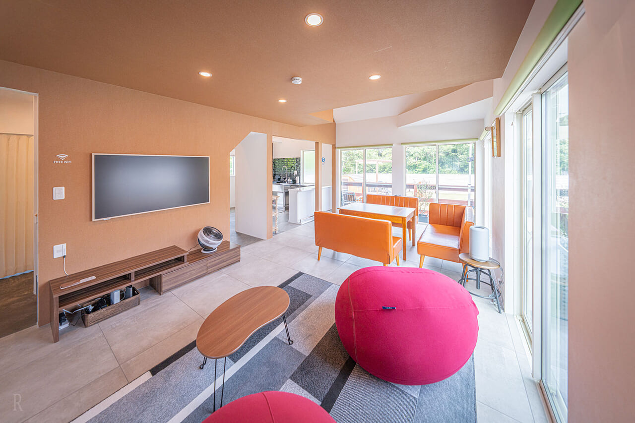 リビングには大きなヨギボーが置かれていて、座るとそのまま動けなくなるほど快適(笑)。キッチンもダイニングも広く、調理器具や食器類も揃っていて使い勝手も文句なし。ドッグアメニティも揃っています。