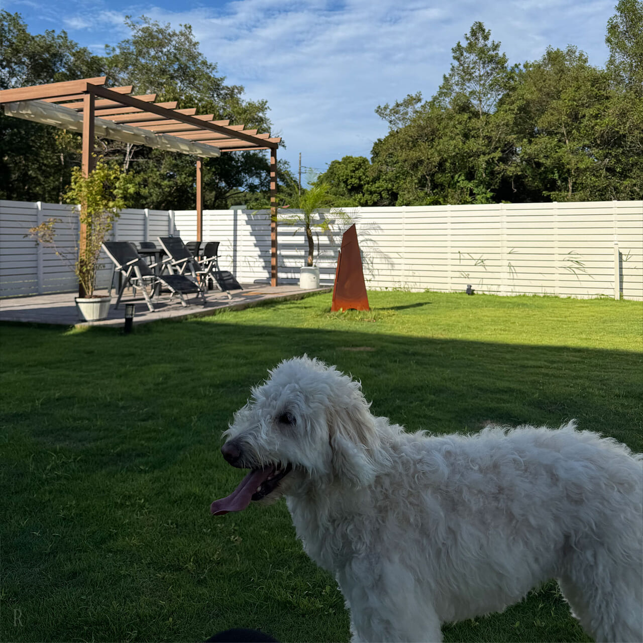 お庭はプライベートドッグランになっており、愛犬を自由に遊ばせることができます。芝生も綺麗に整えられていて、リビングから直接出られるのが便利!高い壁で覆われているので外からの視線も気にならず、何よりとっても広いので大型犬でも窮屈感なく走らせてあげられるのは嬉しいですね。設置されていたハンモックで、エルモと一緒にゆらゆらと楽しみました。