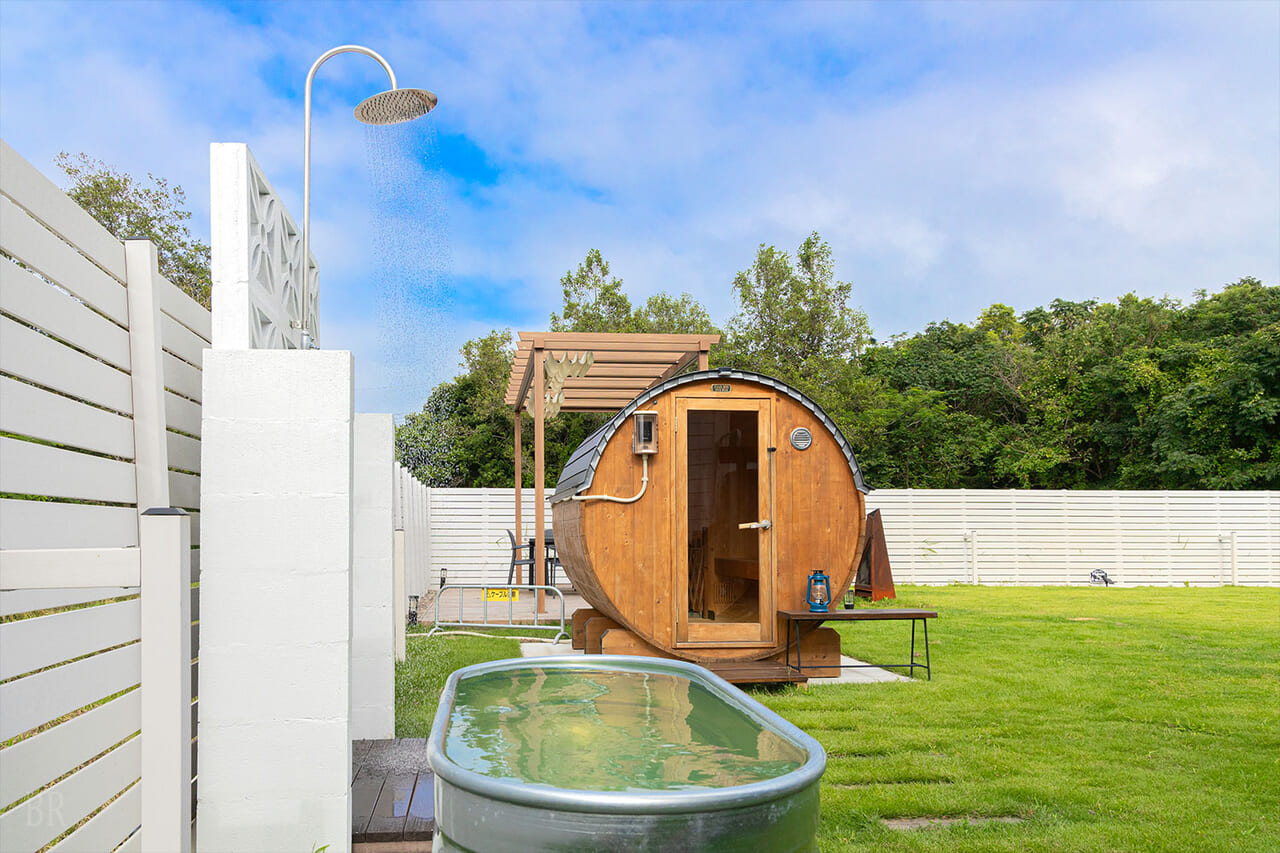 お庭には日本製のバレルサウナと冷水タブがあり、癒しの時間が楽しめるのもこのお宿のウリ。我が家もサウナに入る気満々だったのですが、温める時間が思ったよりもかかってしまい、断念することに…。サウナグッズも置いてあり、本格的なリトリート体験ができるので、サ活派にもぴったりだと思います。