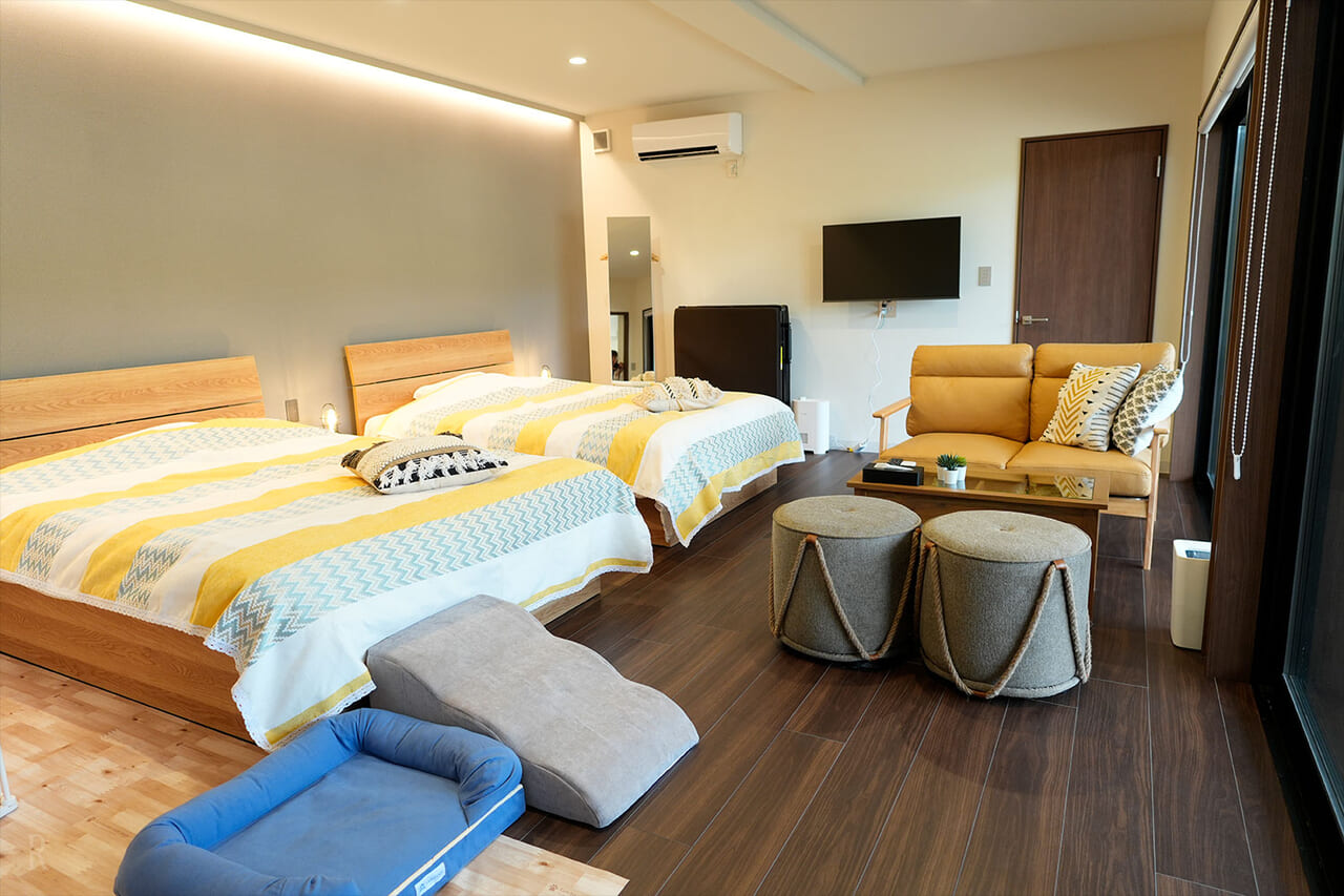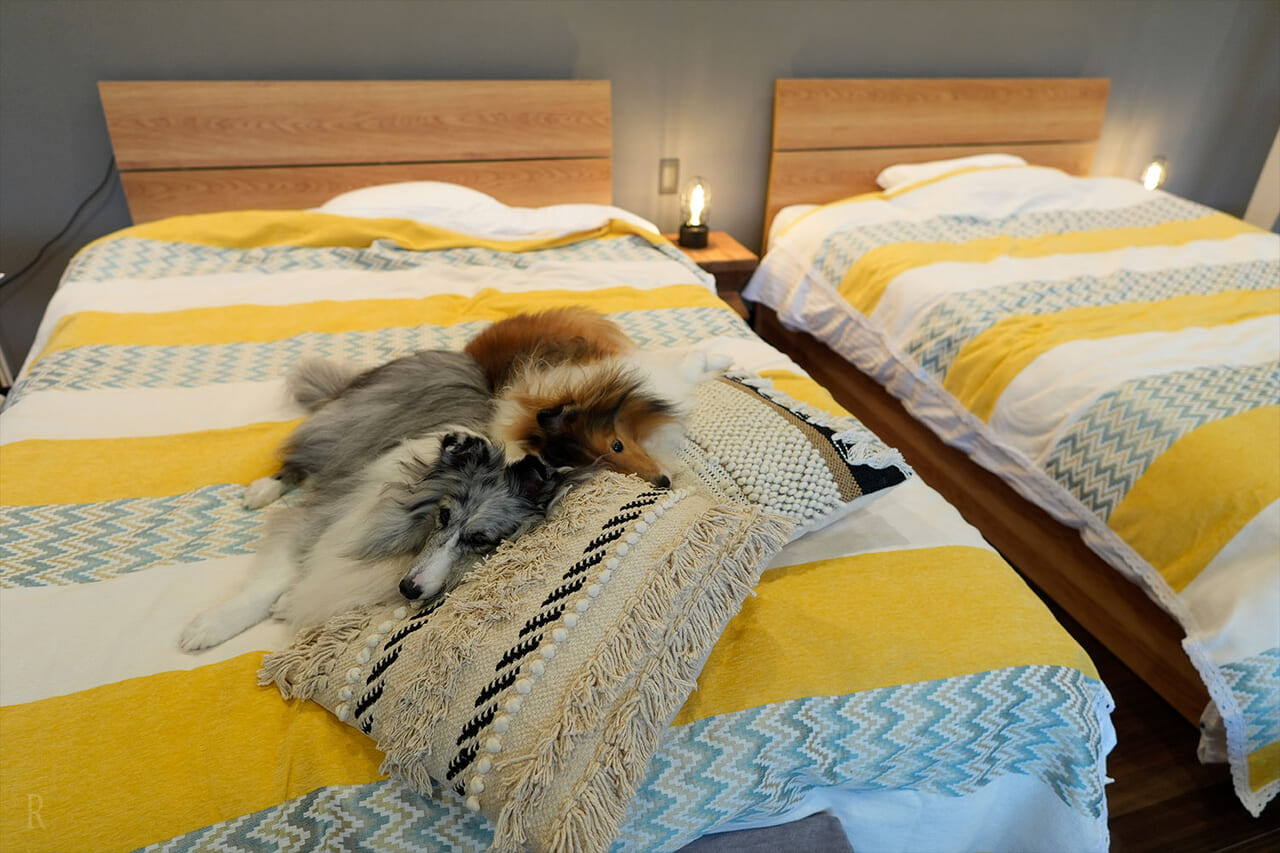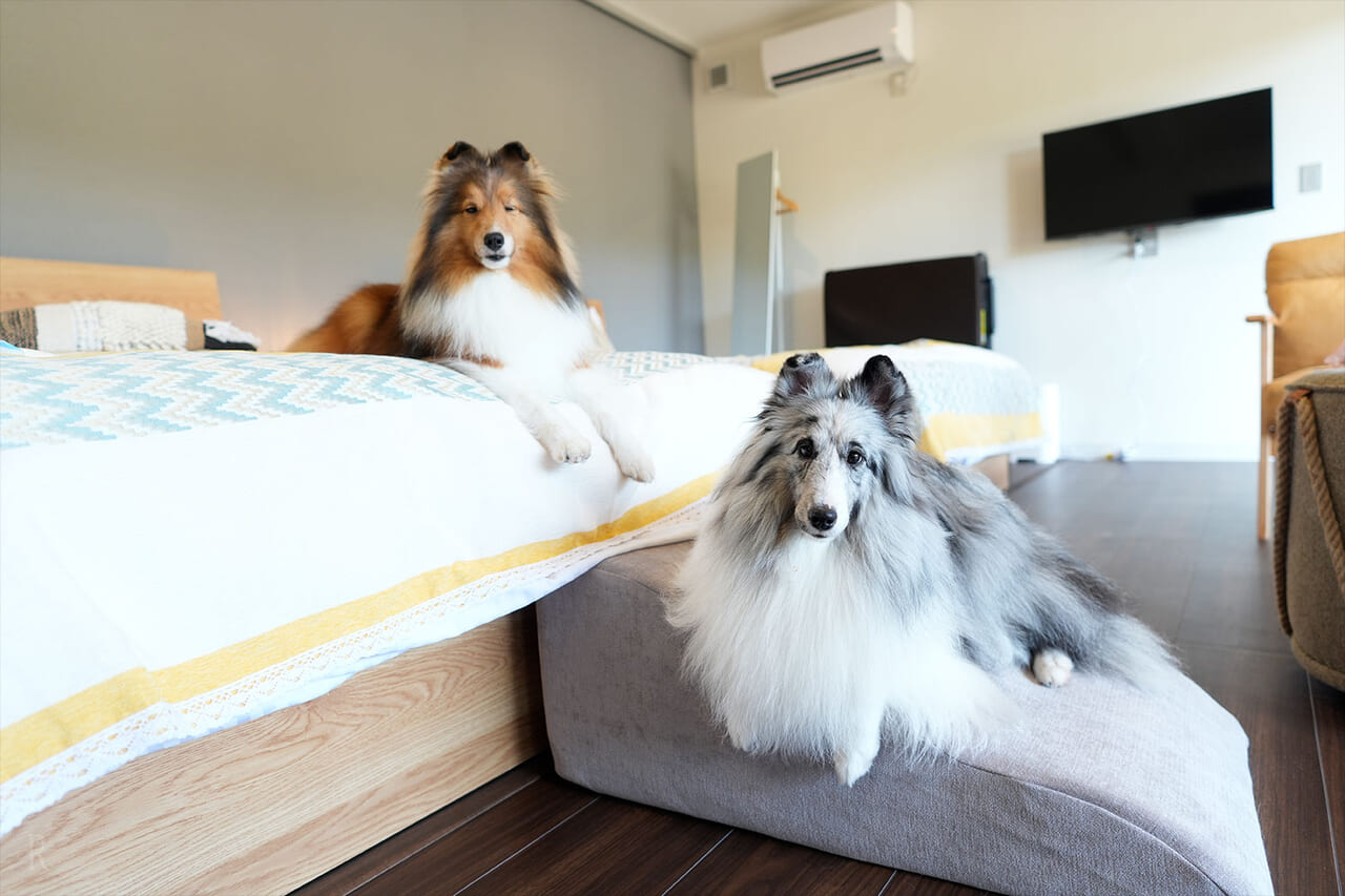 アメニティの充実度はもちろん、わんこの足腰に配慮された床材のおかげで、りんおともすぐにリラックスし、嬉しそうに探検を始めていました。ソファーやベッドの高さもちょうど良く、愛犬たちもすぐにくつろげる空間でした。
