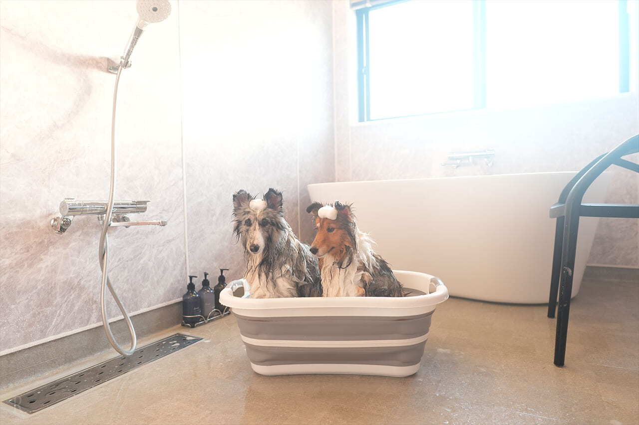 食後はゆったりとお風呂でリラックス。湯船に浸かりながら外の木々を眺めていると、まるで森の中の温泉にいるような気分。さらに驚いたのは、わんちゃん用のバスタブに加え、ブロアーまで完備されていたこと!その至れり尽くせりな設備に、「このまま住みたい」と思ってしまったほどです(笑)。
