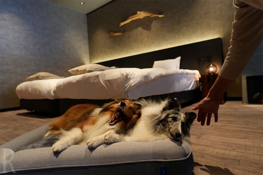 今回宿泊したのが「Dog Superior」のお部屋。シックで高級感あるインテリアに加え、滑りにくい床材や床暖房が完備されており、寒い季節でも愛犬が快適に過ごせるよう工夫されています。訪れたときは雪が残る寒さでしたが、りんは床暖房の温かさがお気に入りだったようで、のびのびと寝ていました。