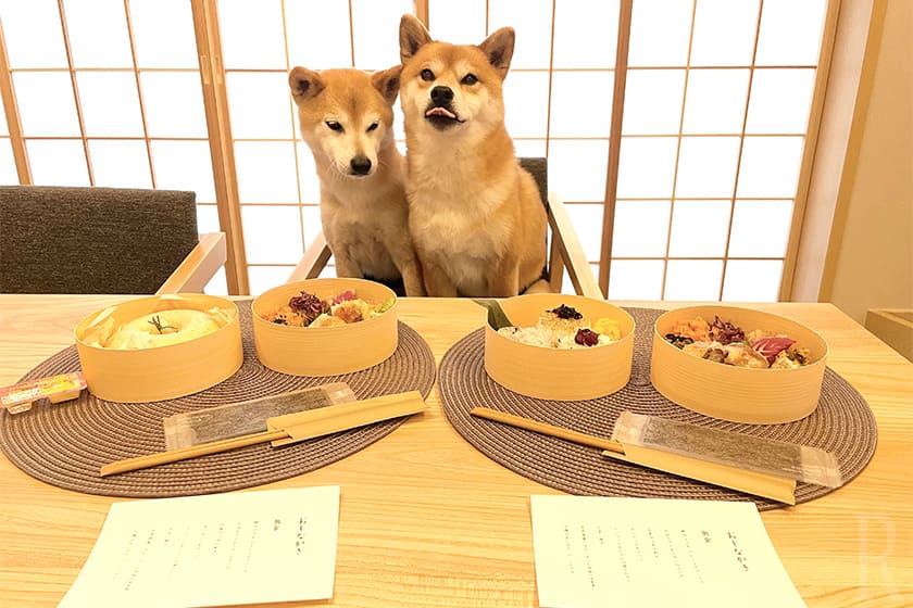 朝食は季節の野菜を使用した6種のおばんざいとメインが入ったわっぱ弁当。メインは日替わりのパンかおにぎりからチョイスできます。おにぎりは京丹波産のコシヒカリを使用したこだわりの逸品。今回はひとつずつオーダーしたのでベーグルとおにぎりの両方を楽しむことができました。朝からほっこり時間が楽しめる粋な演出に大満足です。なお、朝食には愛犬用のメニューは用意されていませんが、前夜の食事で十分満足していたようです。