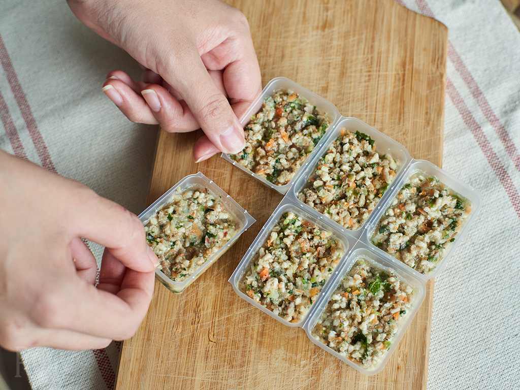 「犬猫生活 犬用手作りごはん」は、冷凍の小分けパックだから、必要な分だけサッと取り出して電子レンジで温めるだけでOK!手やお皿が汚れにくいので、忙しい時でもすぐに用意できます。