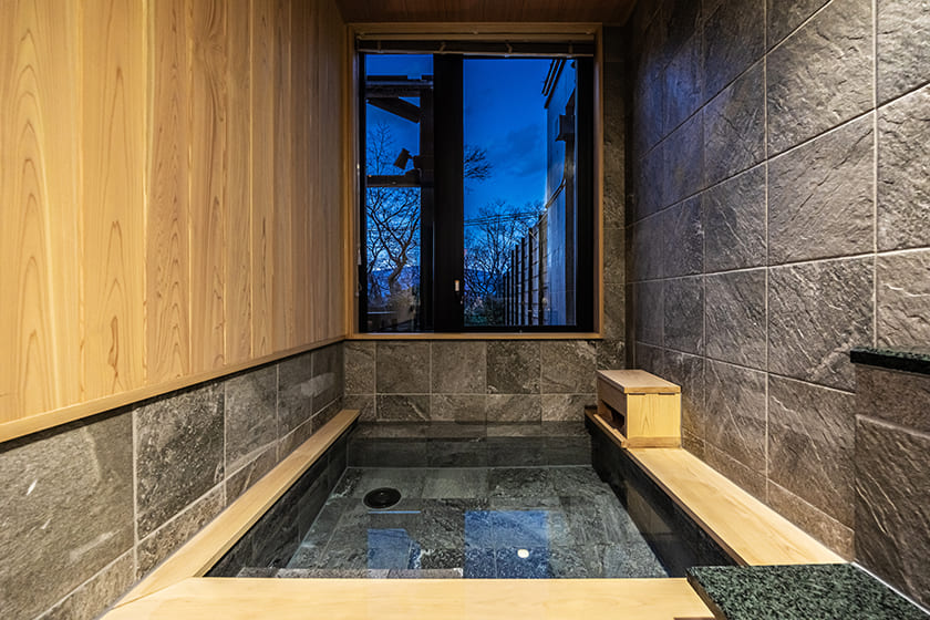 愛犬が喜ぶポイントばかりお伝えしましてしまいましたが「モリトソラ箱根」は飼い主に嬉しいサービスもたくさん! そのひとつが各部屋に配された天然温泉です。強羅温泉はとても肌触りが柔らかく、なめらかなのが特徴。貸切なので好きな時に入れるのはもちろんですが、自分の好みの温度に調整できるのも高ポイント。ぬるめのお湯にゆったり浸かるのもよし、熱めのお湯にはいるのもよし。またお湯を全入れ替えもできるのも嬉しいポイントでした。