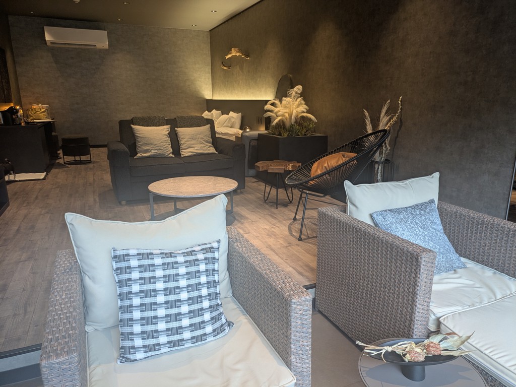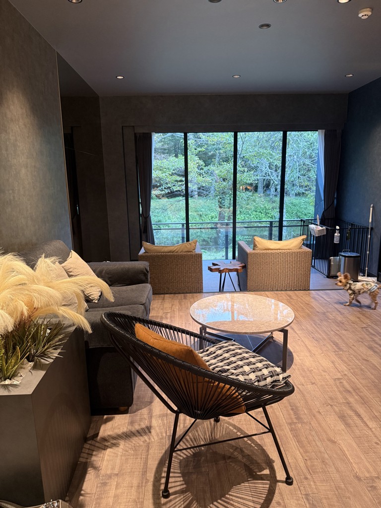オシャレで落ち着いた感じの広いお部屋でした。スタッフの方も丁寧で親切でした。ラウンジもあり、飲み物やワンちゃんのアイスもサービスでした。アメニティも充実してました。タオルも十分用意してくれてあります。近くにコンビニもあり。