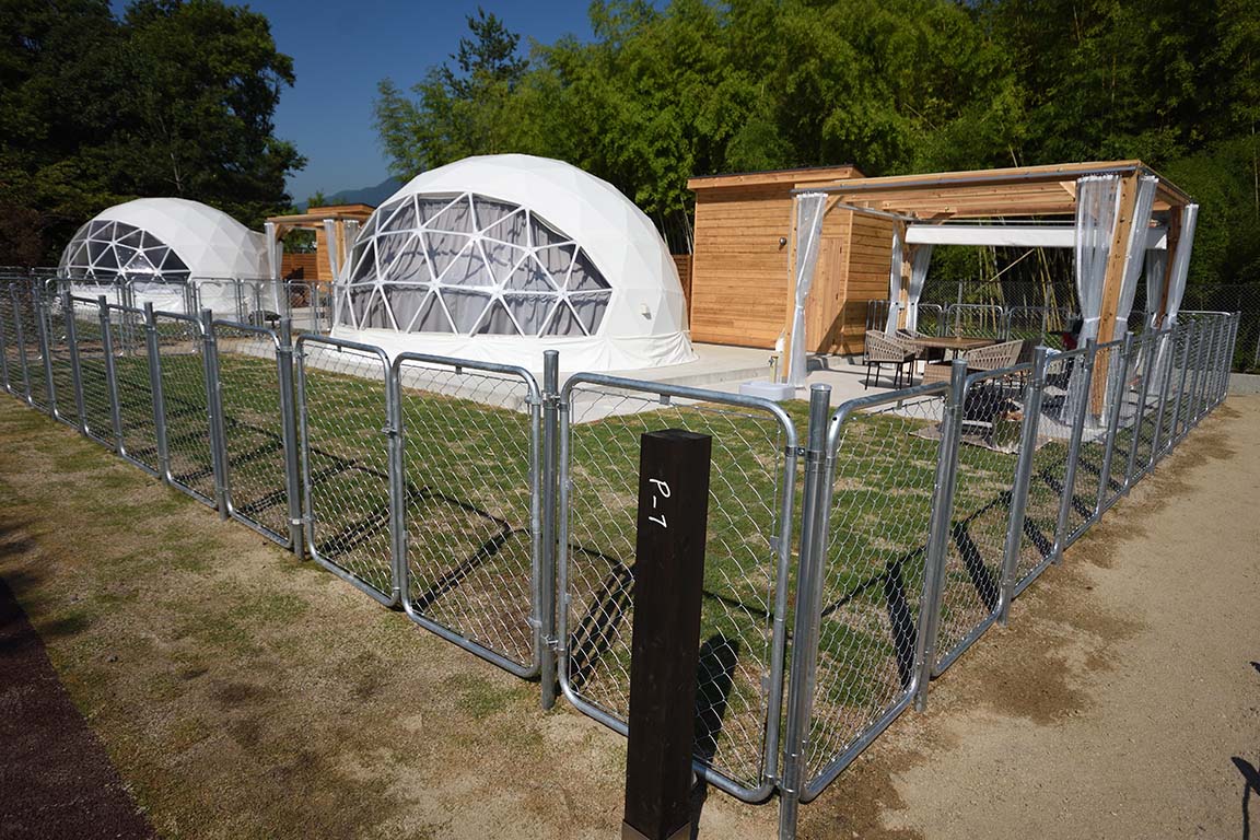 ペット同伴可のドッグラン付き、直径6mのドーム型テント。テント内にはダブルベッドを2台配置しており、4名まで宿泊可能です。専用の食事スペース、トイレ、シャワーも完備しておりますので、ゆったりとプライベート空間をご堪能下さい。