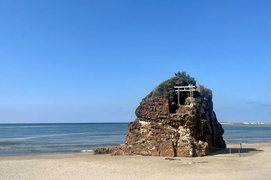 国譲りの神話や国引き神話が残るパワースポットとして人気の稲佐の浜のシンボルになっているのが、浜のシンボルになっている、一際目立つ「弁天島」です。