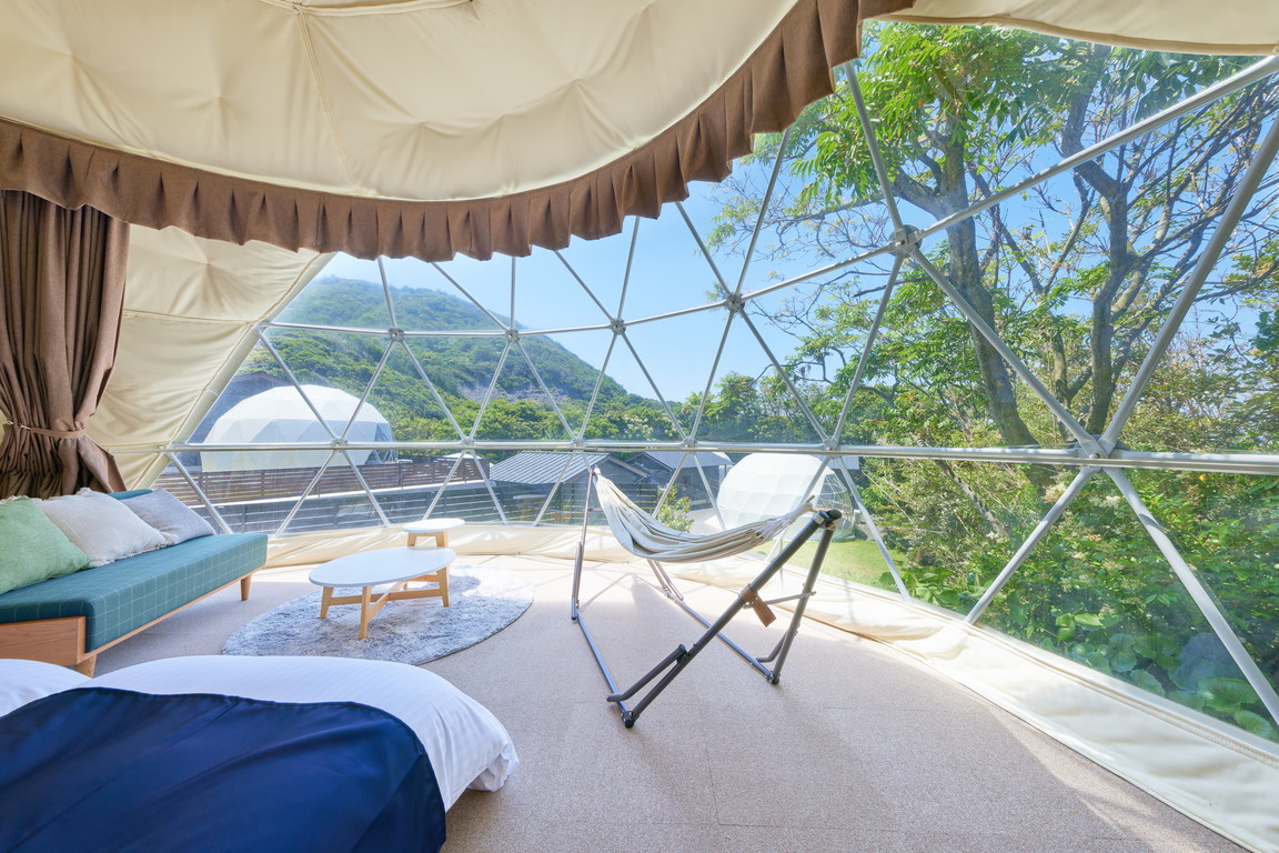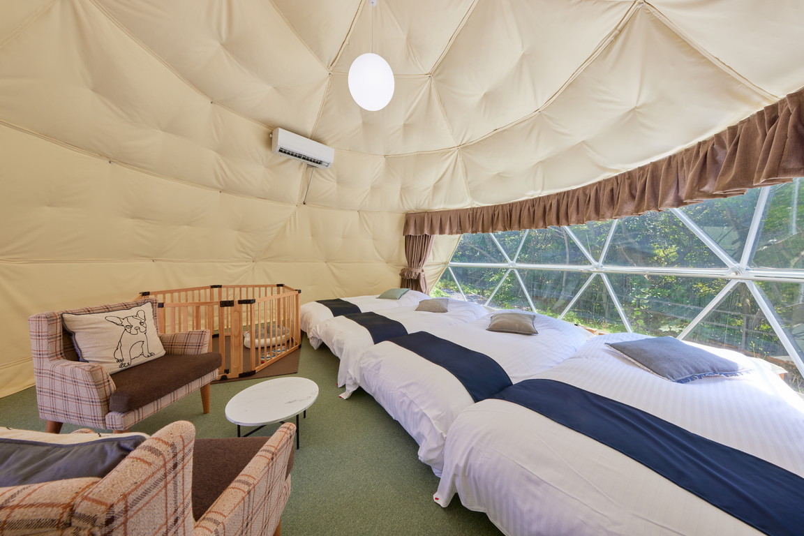 プライベートドッグラン付きで、愛犬をのびのび遊ばせながら、一緒に自然を感じるグランピング滞在をお楽しみいただけます。