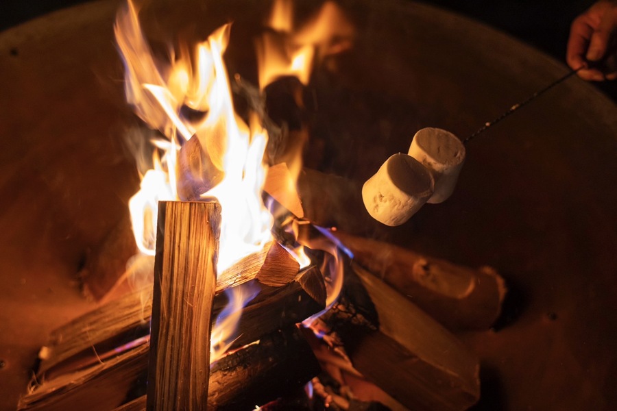 夜は共有の焚火スペースで、アウトドアの定番・焼きマシュマロ体験。