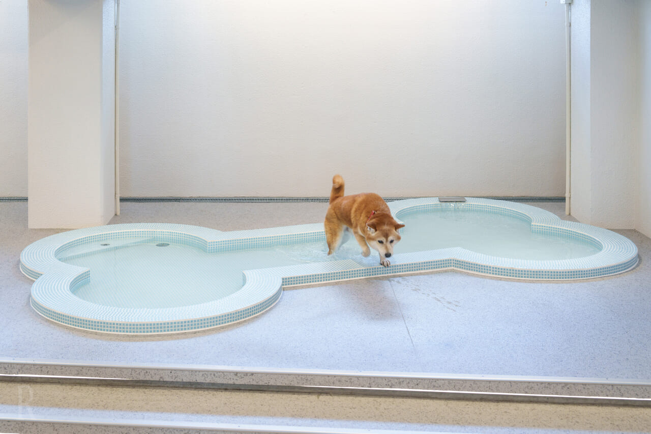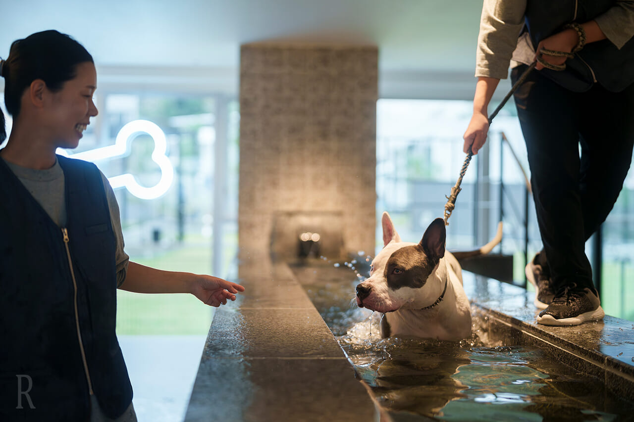 緩やかな傾斜で運動能力を引き出す天然芝エリア、足腰に優しく夏でも快適な人工芝エリアをご用意。さらに、雨の日も安心な半屋内エリアには愛犬を癒す足湯を完備しています。