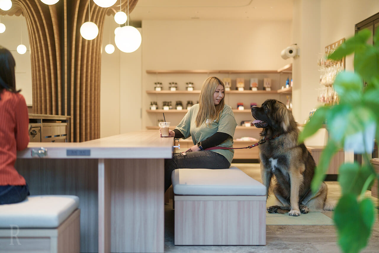 座席の高さにも工夫を施し、わんちゃんと同じ目線でくつろげる特別なひとときを演出。大切な愛犬と一緒に、ゆったりとカフェタイムをお楽しみください。 -