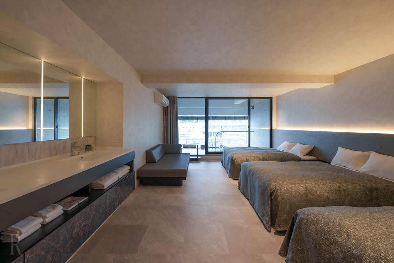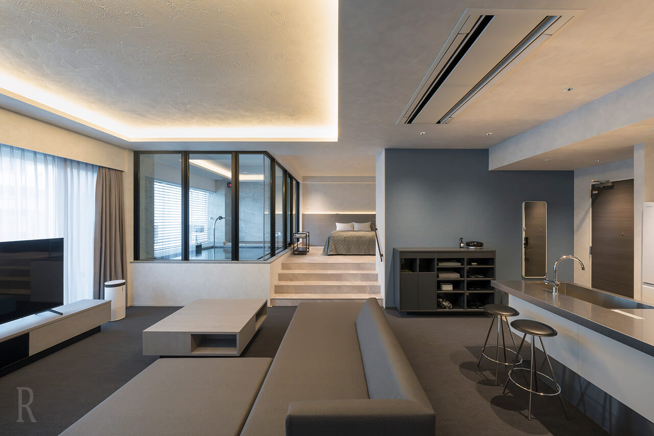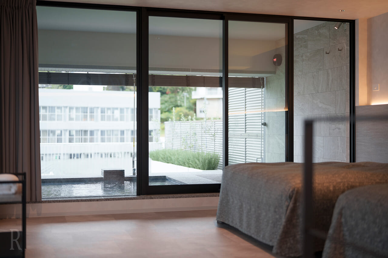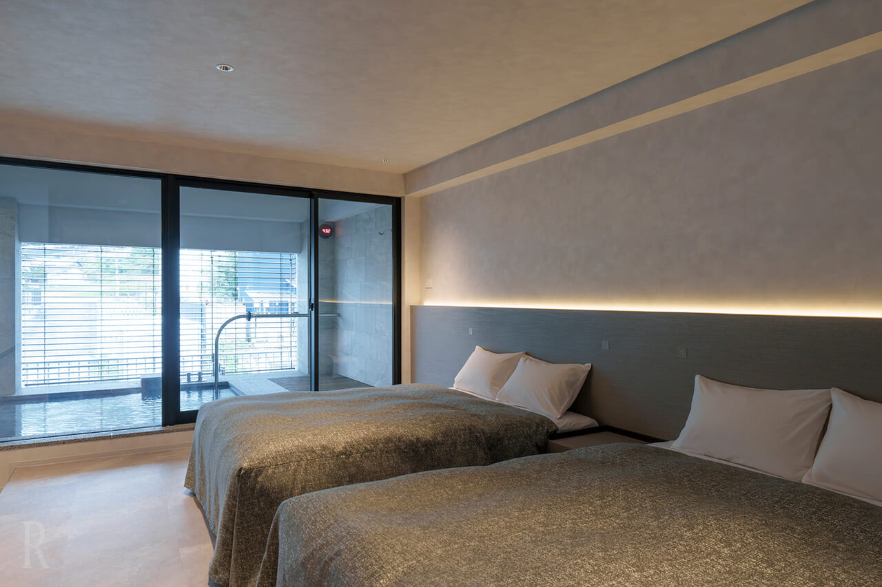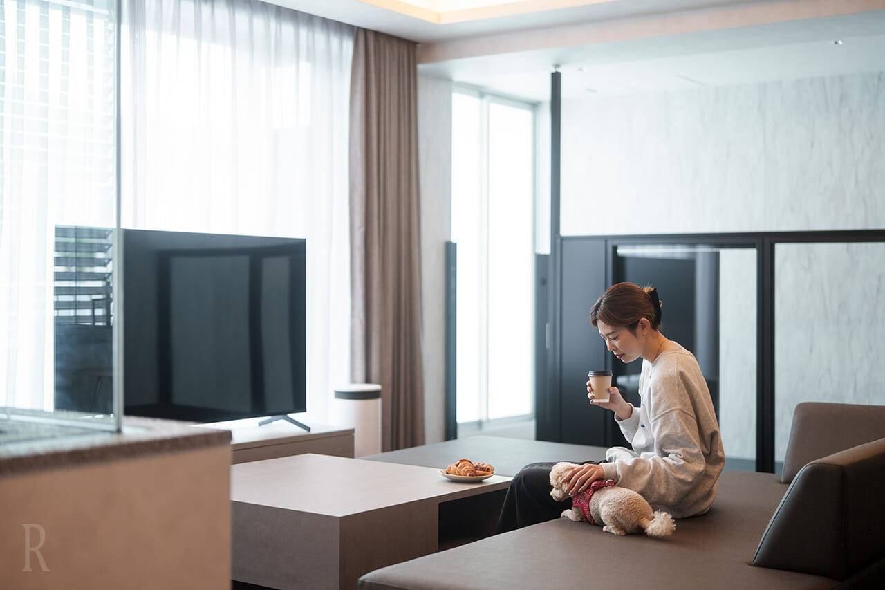 愛犬と一緒に自然の景色を眺めながら寛げる80㎡のスイート。窓の外に広がる穏やかなガーデンビューが、心と体を静かに癒やします。