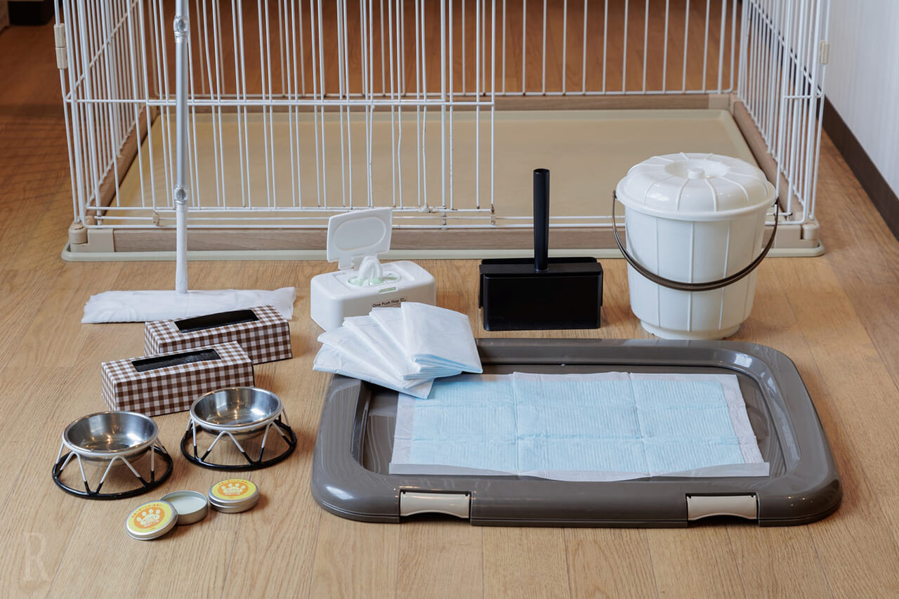 - ケージ、ワンちゃん用食器、ペットシート、ワンちゃん用コロコロ、ワンちゃん用ゴミ、ウェットティッシュ、フローリングワイパー、置き型消臭剤