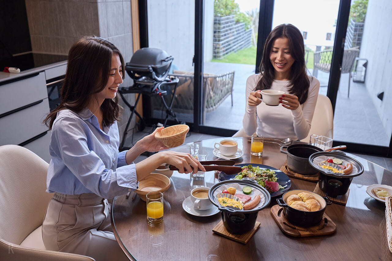 ディナーは食べ応えたっぷりの満足感あふれる内容。食べきれなかったお料理は客室の冷蔵庫で保管でき、お夜食のおつまみにしたり、翌朝のモーニングに添えてさらに華やかな食卓を楽しんだりと、自由にアレンジしていただけます。朝食には、新鮮野菜のサラダや自家製スムージーなど、爽やかな洋朝食をご用意しております。