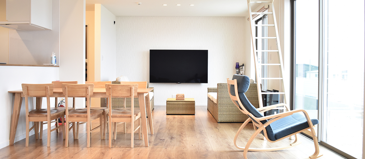 大人数でもゆったり寛げるリビングスペース。暮らすように過ごせる充実の設備を備えた1棟貸切のプライベートヴィラ。セミダブルベッド 4台、シングル布団 1組を備え、定員5名までご宿泊いただけます。 リゾート地の淡路島で貸し別荘スタイルで気兼ねなくお過ごし頂けます。