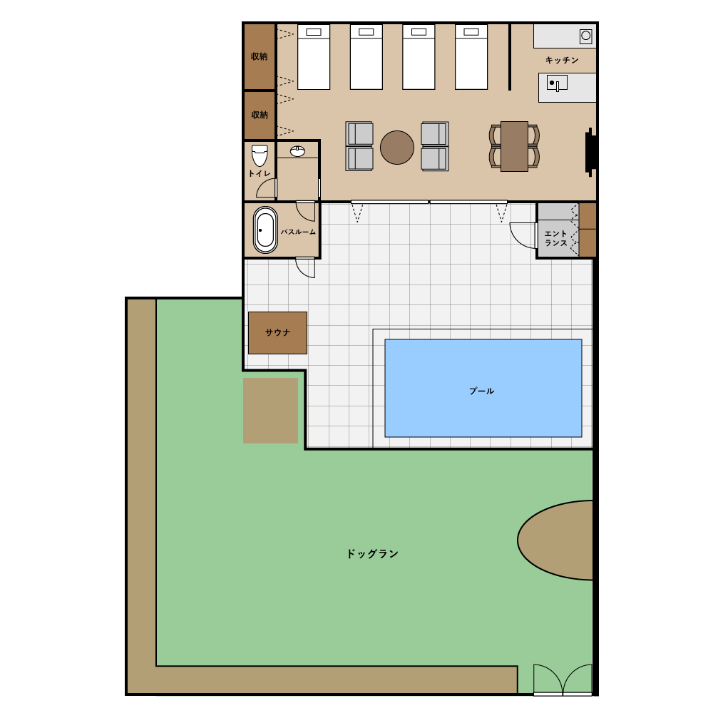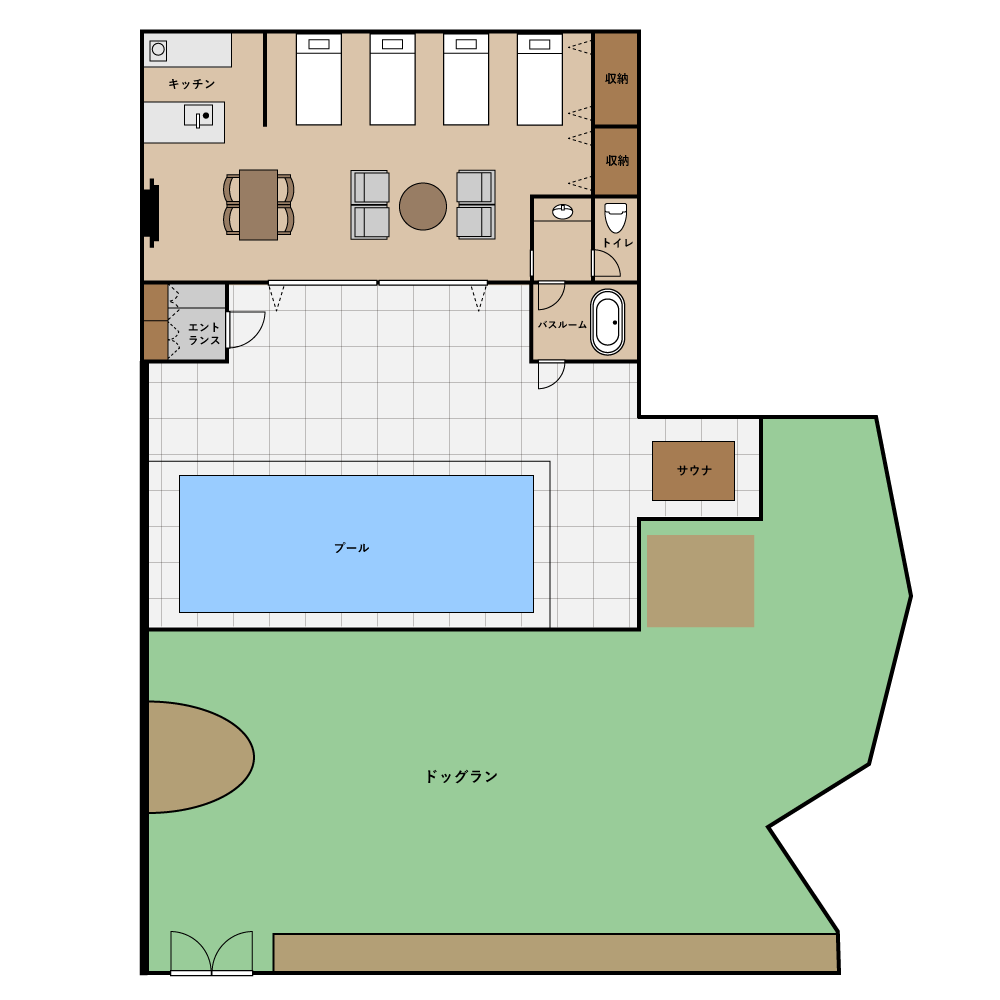 テラスからプールを抜け、そのままドッグランへ出られる動線で、移動のストレスもなく快適。