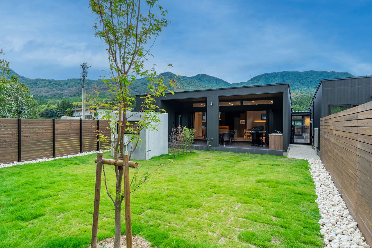 プライベートガーデンにはお洒落なアウトドアソファとキャンプファイヤーが楽しめるファイヤーピット(焚き火台)を配しました。プライベートなアウトドア空間をお楽しみください。