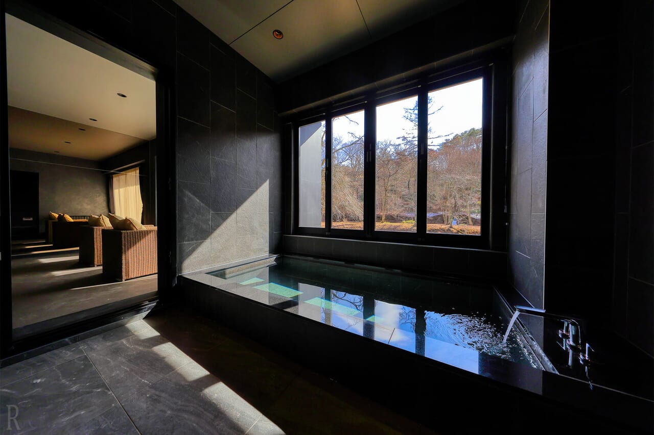 富士山の雪解け水が岩肌に染み、数十年の歳月をかけて地底を流れた透明な湧水を使用した客室風呂を各棟に設置。