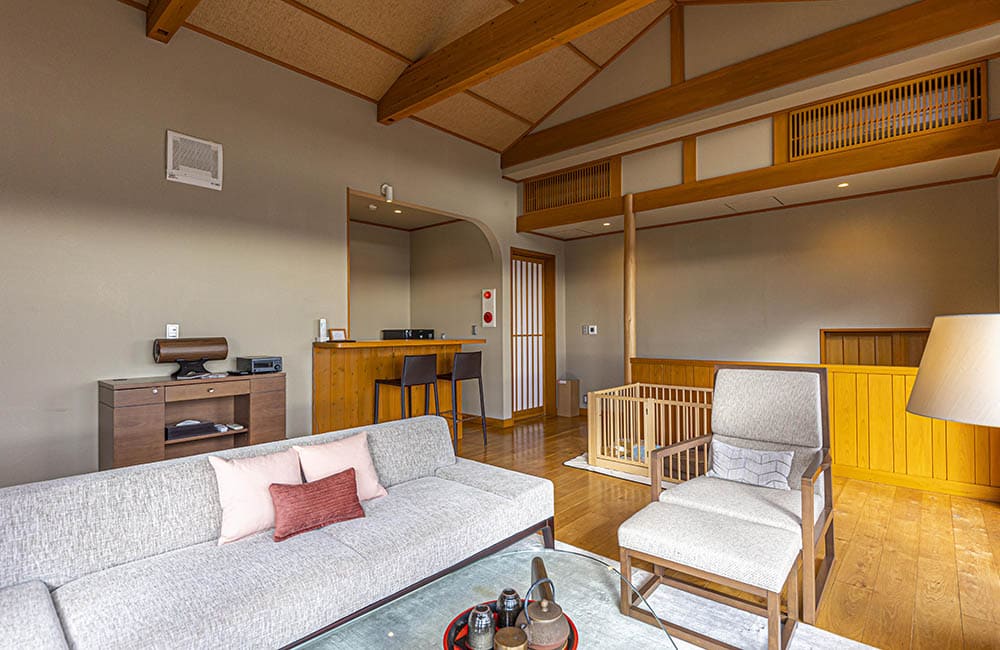 専有面積100㎡を超えるプライベート空間には、天然温泉の内湯・露天の2種の温泉を備え、客室リビングからは自然との繋がりを感じる大きな窓を配置し、雄大な自然を愉しみながらゆったりとお寛ぎいただけます。