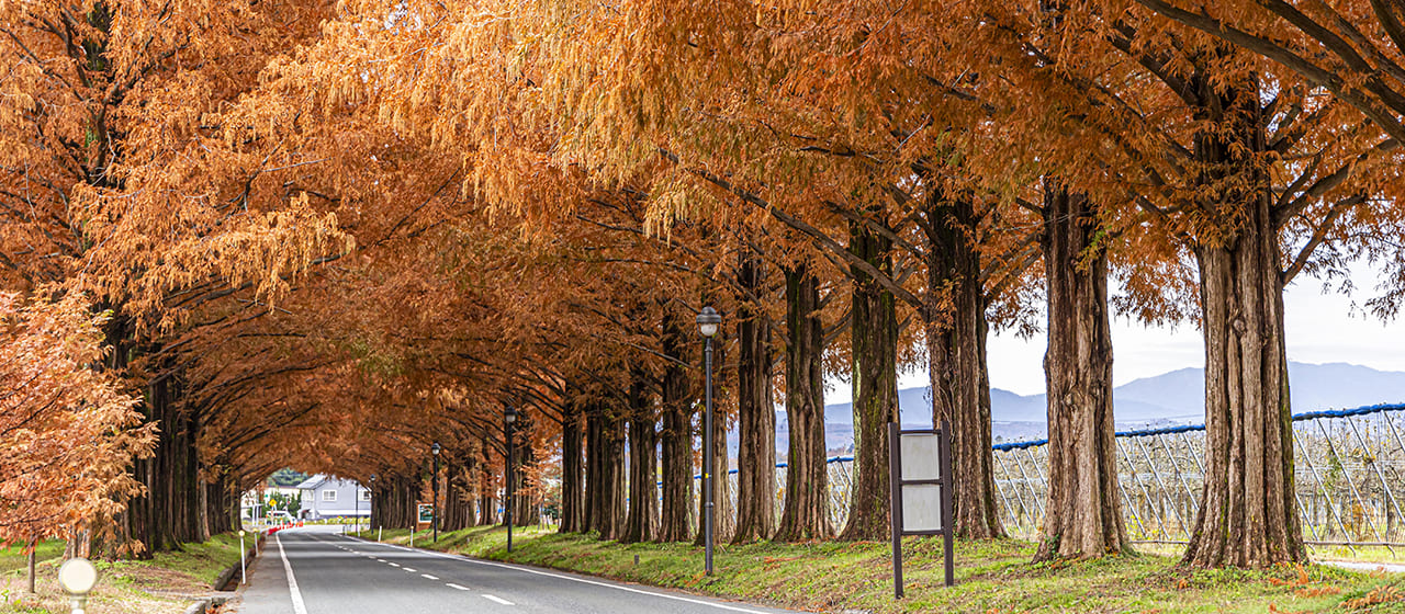 施設からすぐの「メタセコイア並木道」には延長約2.4kmにわたりメタセコイアが約500本植えられています。