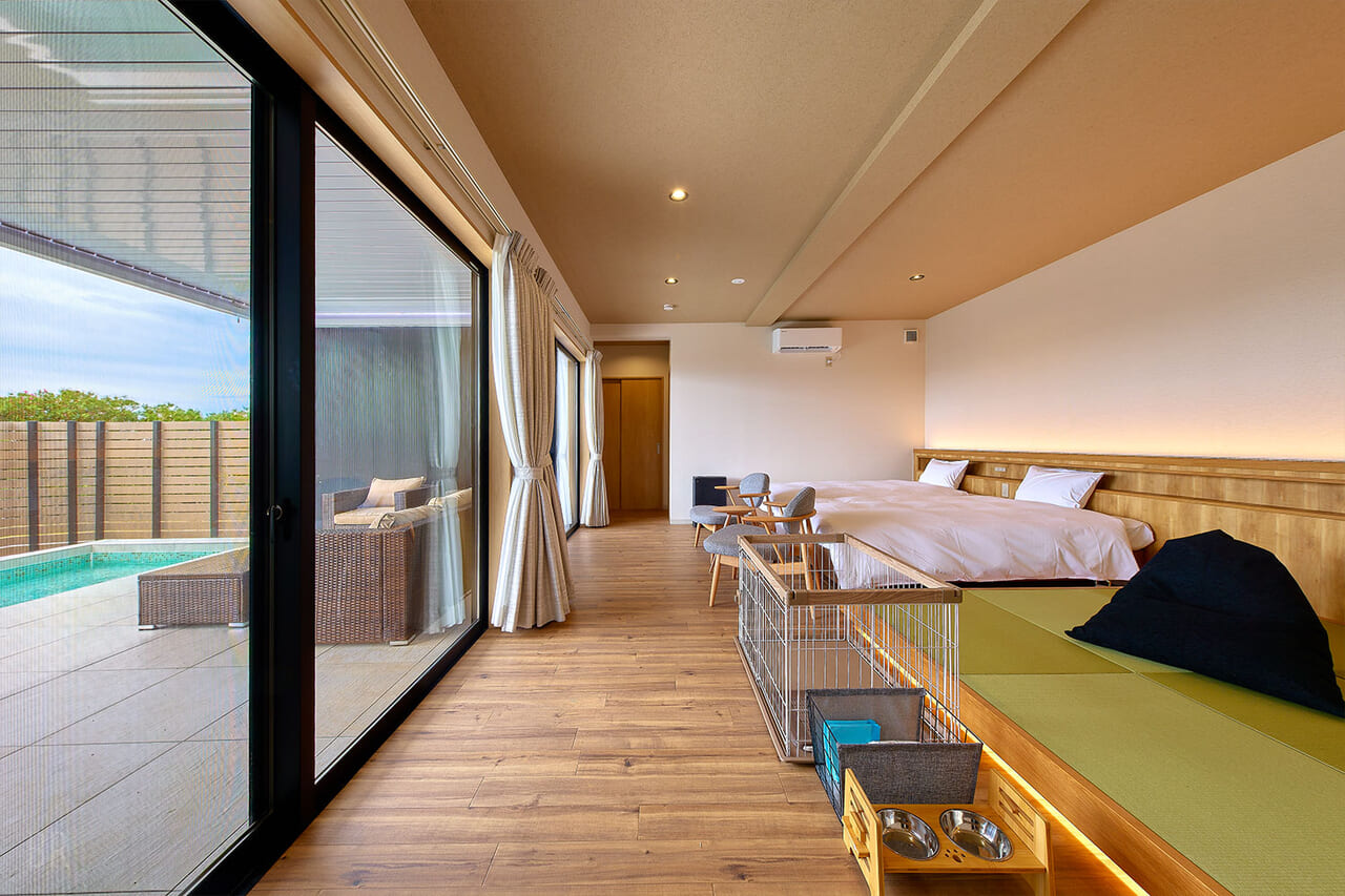 愛犬と一緒に入れるプライベートプールや、1棟限定の専用ドッグランを完備。美しい自然の中で、大切な家族の一員であるワンちゃんと心ゆくまでリフレッシュできる、贅沢なひとときをお過ごしください。