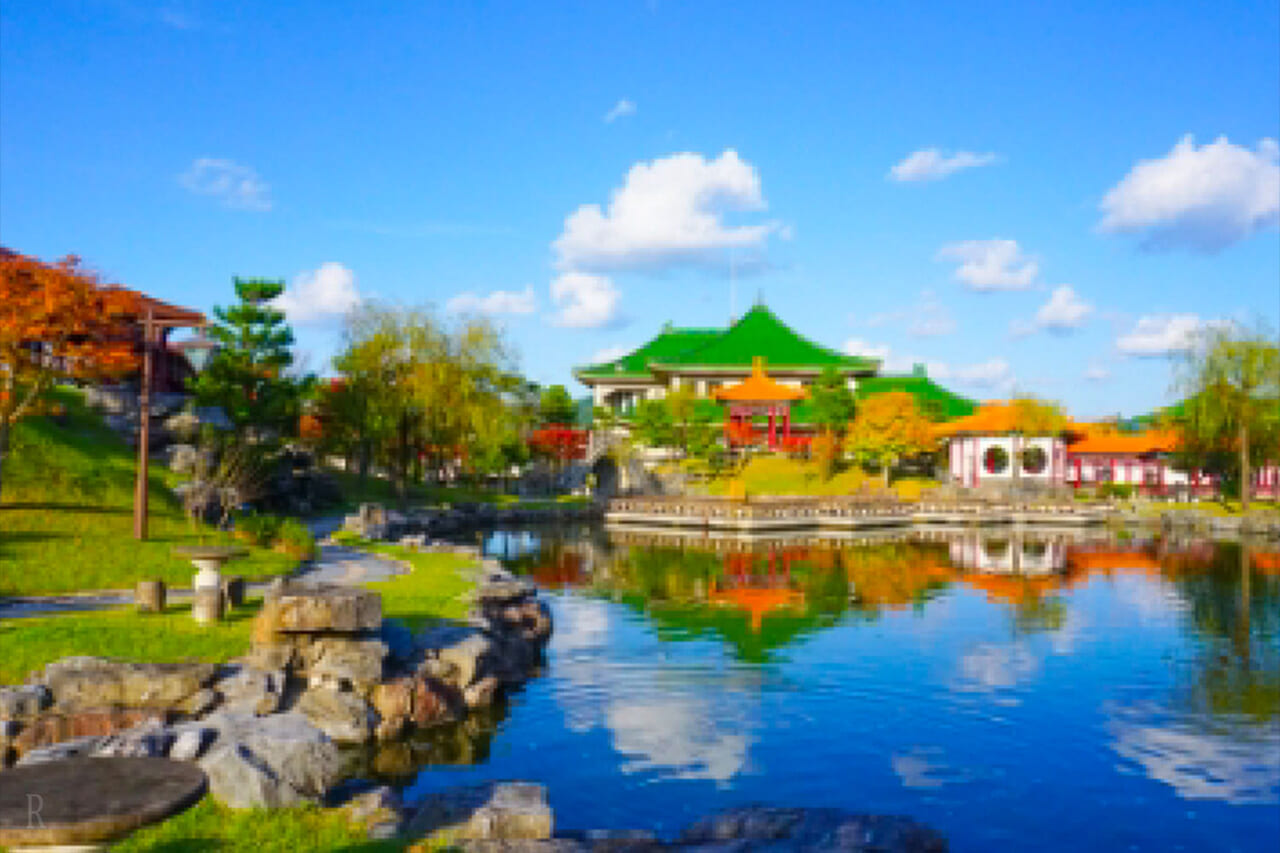 東郷湖のほとりに佇む本格的な中国様式の庭園です。設計は中国・河北省の技師が手がけ、建材もすべて中国から取り寄せて造られました。背景には山々や東郷湖の景観を巧みに取り入れ、周囲の自然と見事に調和した美しい庭園が広がります。園内は、ペット用カートやキャリーの利用、抱っこでの散策が可能です。