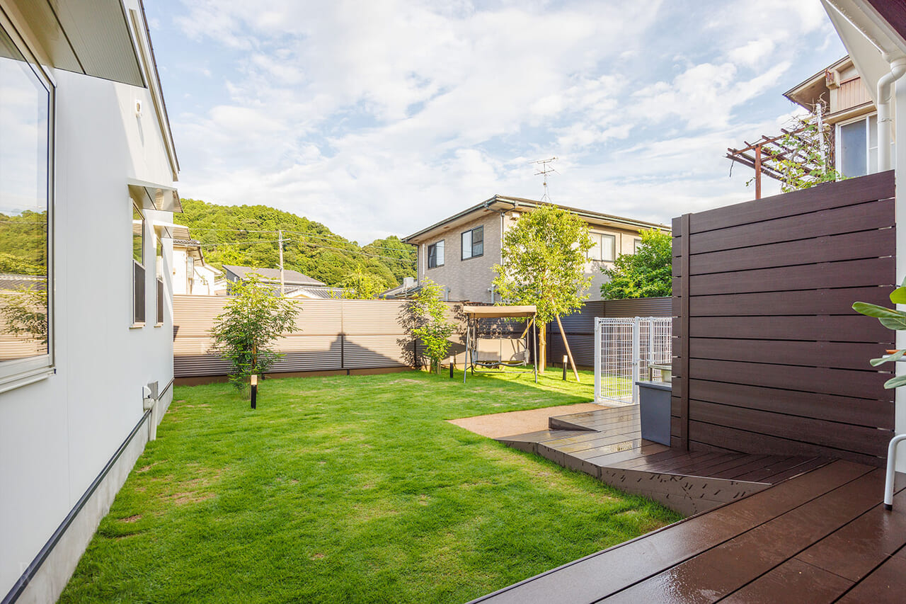 広々とした天然芝の中庭とドッグランは、駐車場や室内のアウトリビングから直接出入りできる完全なプライベート空間。