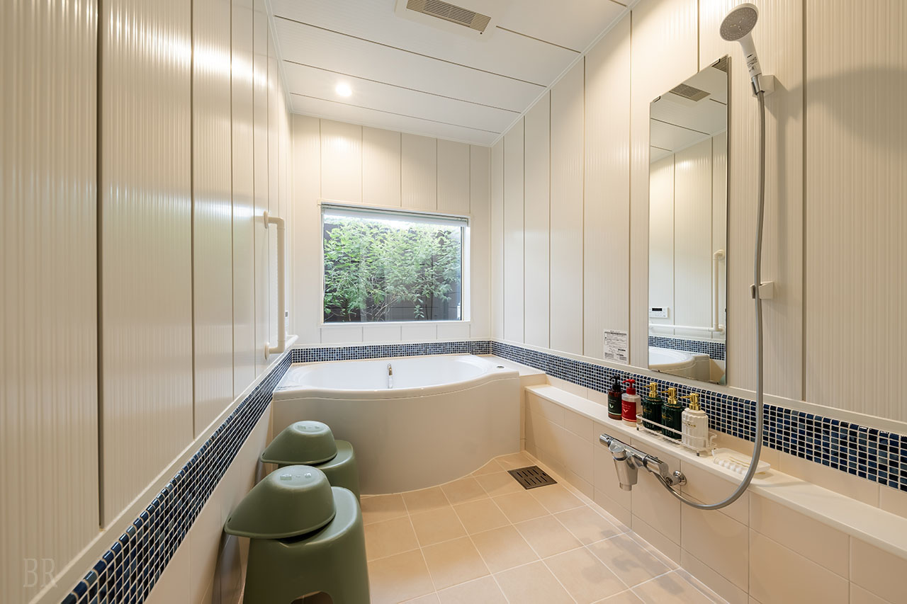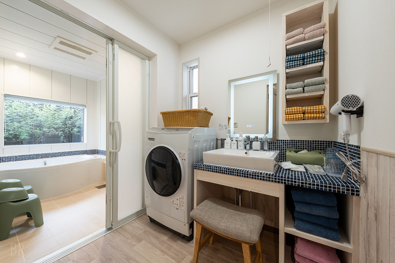 ブルーのタイルが印象的な洗面脱衣室と、ゆとりあるバスルームを備えた清潔感あふれる水まわり。