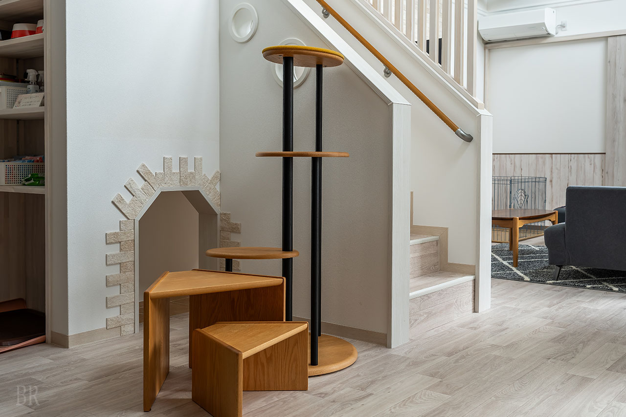 別邸余戸谷にはキャットタワーのほか、背もたれや肘掛けがキャットウォークとして機能する特製ダイニングソファを設けており、愛猫とともに快適な時間をお過ごしいただけます。
