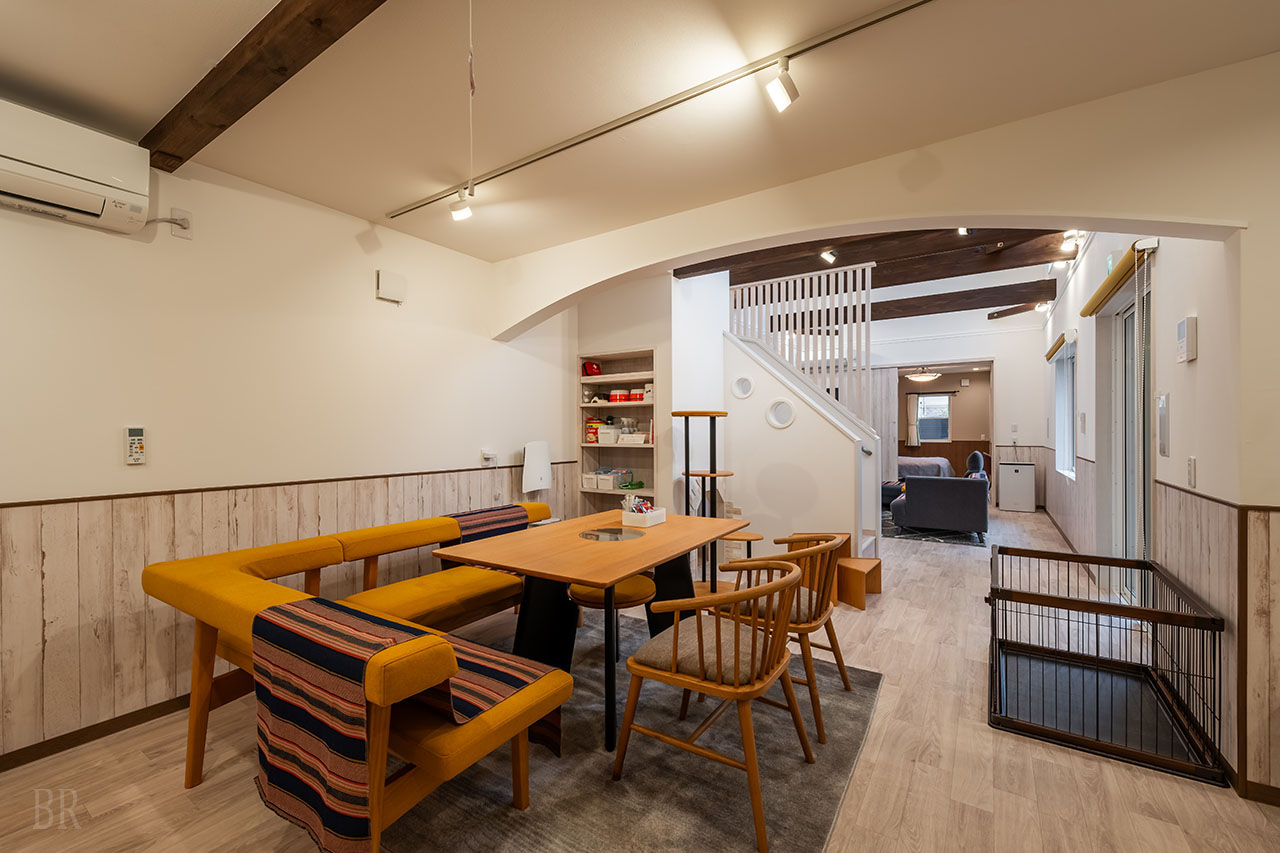 白壁の趣と南仏の開放感に包まれる、ドッグラン併設の一棟貸切宿。 倉吉の伝統的な外観と南フランス風の内装が調和した一棟貸切の宿。約100㎡の専用天然芝ドッグランで、愛犬と自由に過ごせるのが魅力です。自炊ができるキッチン・備品も完備しており、長期滞在や愛犬連れのゆったりとした旅行に最適です。