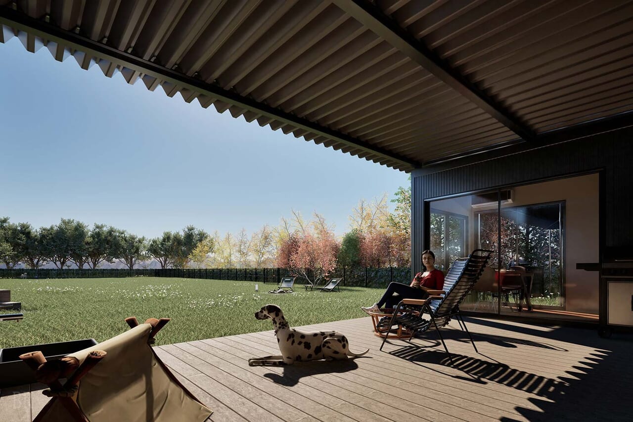 ⼭梨県河⼝湖エリアの⾃然豊かな場所に、愛⽝家必⾒の7棟限定のプライベートドッグラン付グランピング施設が誕⽣します。